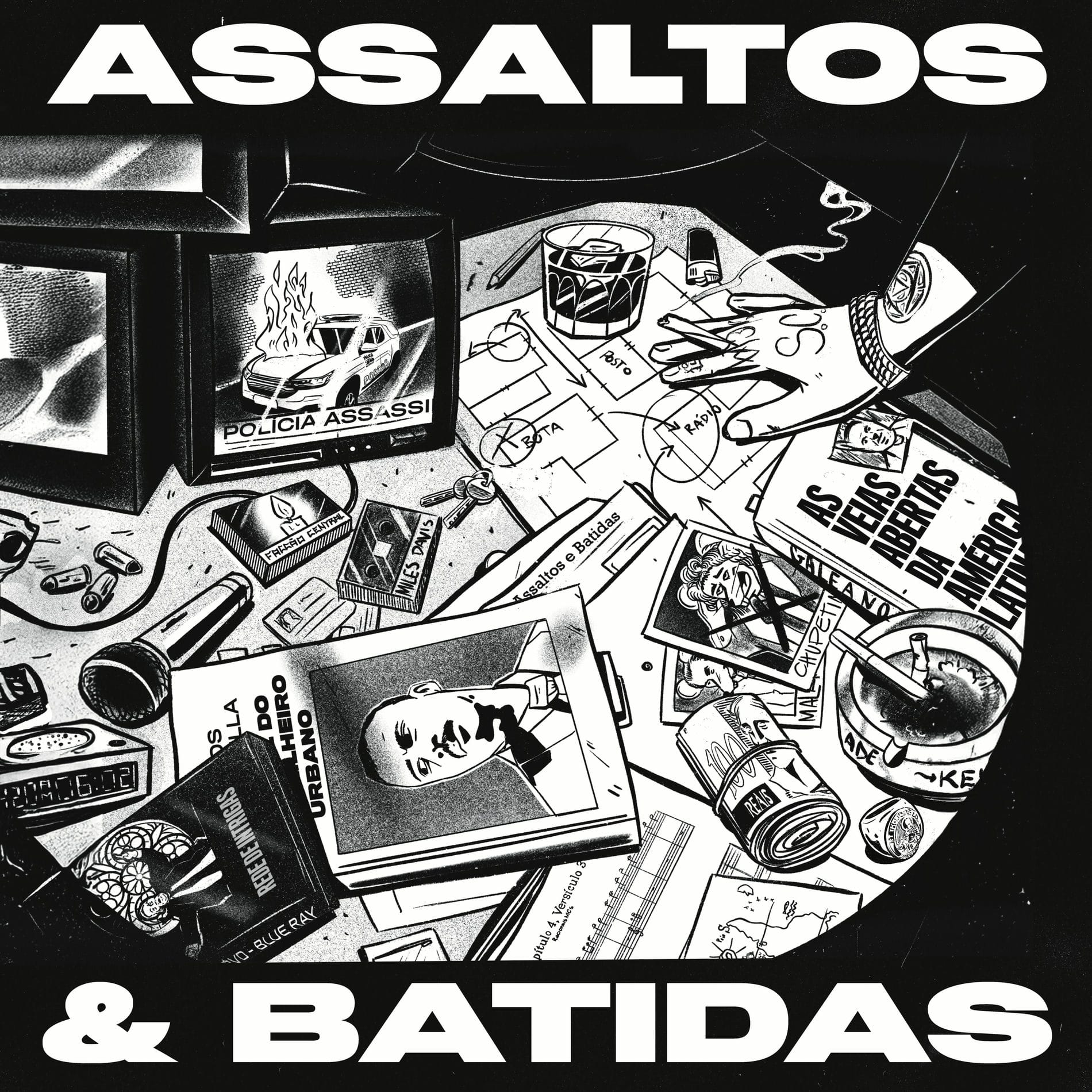 Assinada por Keko, tatuador e ilustrador mineiro, a capa se constrói a partir de uma estética de alto contraste inspirada nos quadrinhos noir, com ecos evidentes de Sin City, Watchmen e Maus. A imagem captura o instante da conspiração — aquele momento suspenso em que um plano está sendo arquitetado. As referências atravessam a composição de forma densa e entrelaçada, indo de Carlos Marighella a As Veias Abertas da América Latina, passando pela América Invertida de Joaquín Torres García e por homenagens a Miles Davis, Racionais MCs e Facção Central. O resultado é uma capa que opera como mapa simbólico de referências cruzadas, pensamento crítico, tensão urbana e memória de resistência.