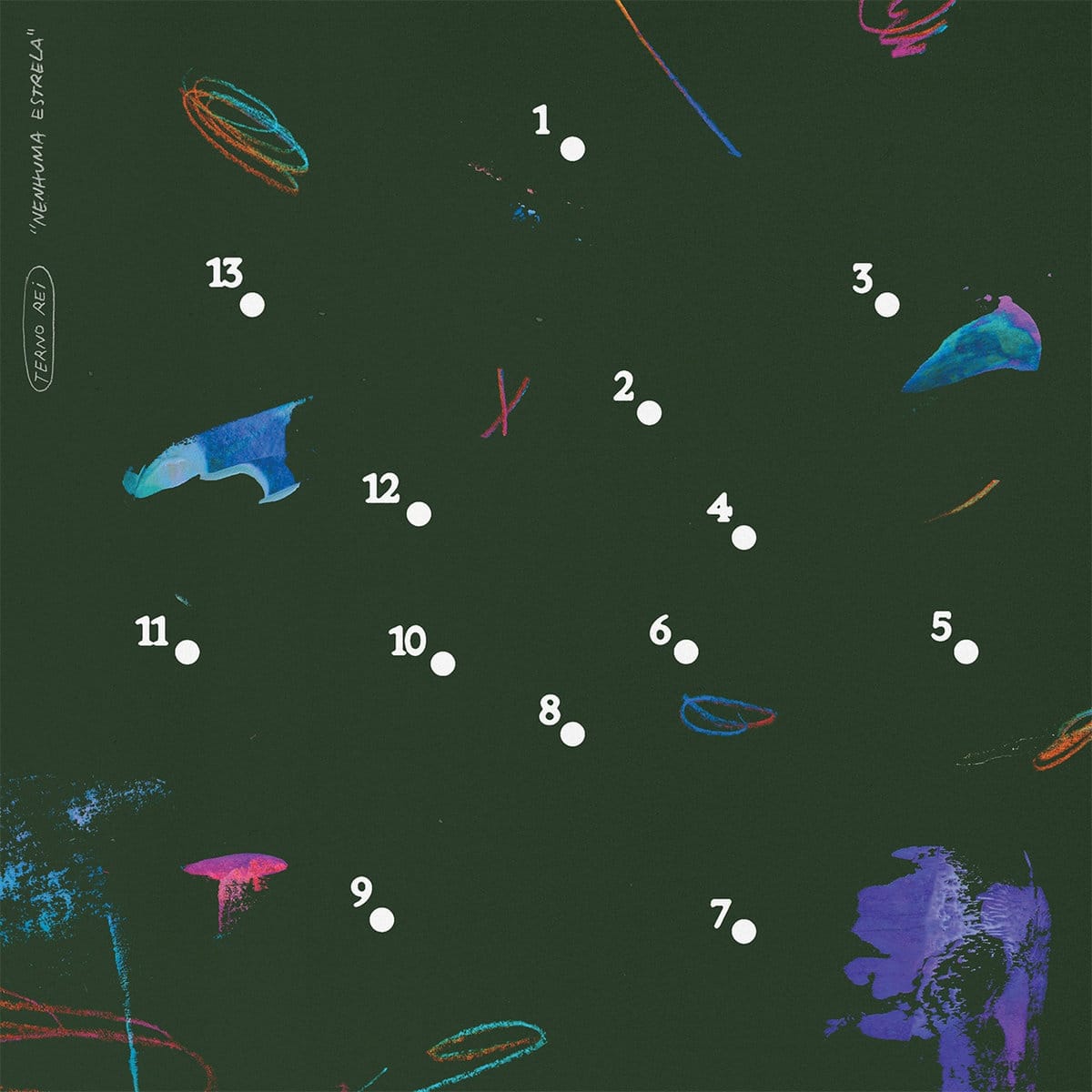 Assinada pelo designer português Braulio Amado, que já assinou capas para Mac Miller e Andre 3000, a arte de Nenhuma Estrela parte de um gesto simples e preciso: um jogo de ligue os pontos que, ao ser concluído, forma uma estrela deliberadamente incompleta. O erro não é falha, é conceito. A imagem trabalha ausência, expectativa e frustração como linguagem visual, criando um paralelo direto com o clima emocional do disco. Um desenho que recusa fechamento e transforma o inacabado em estado permanente.