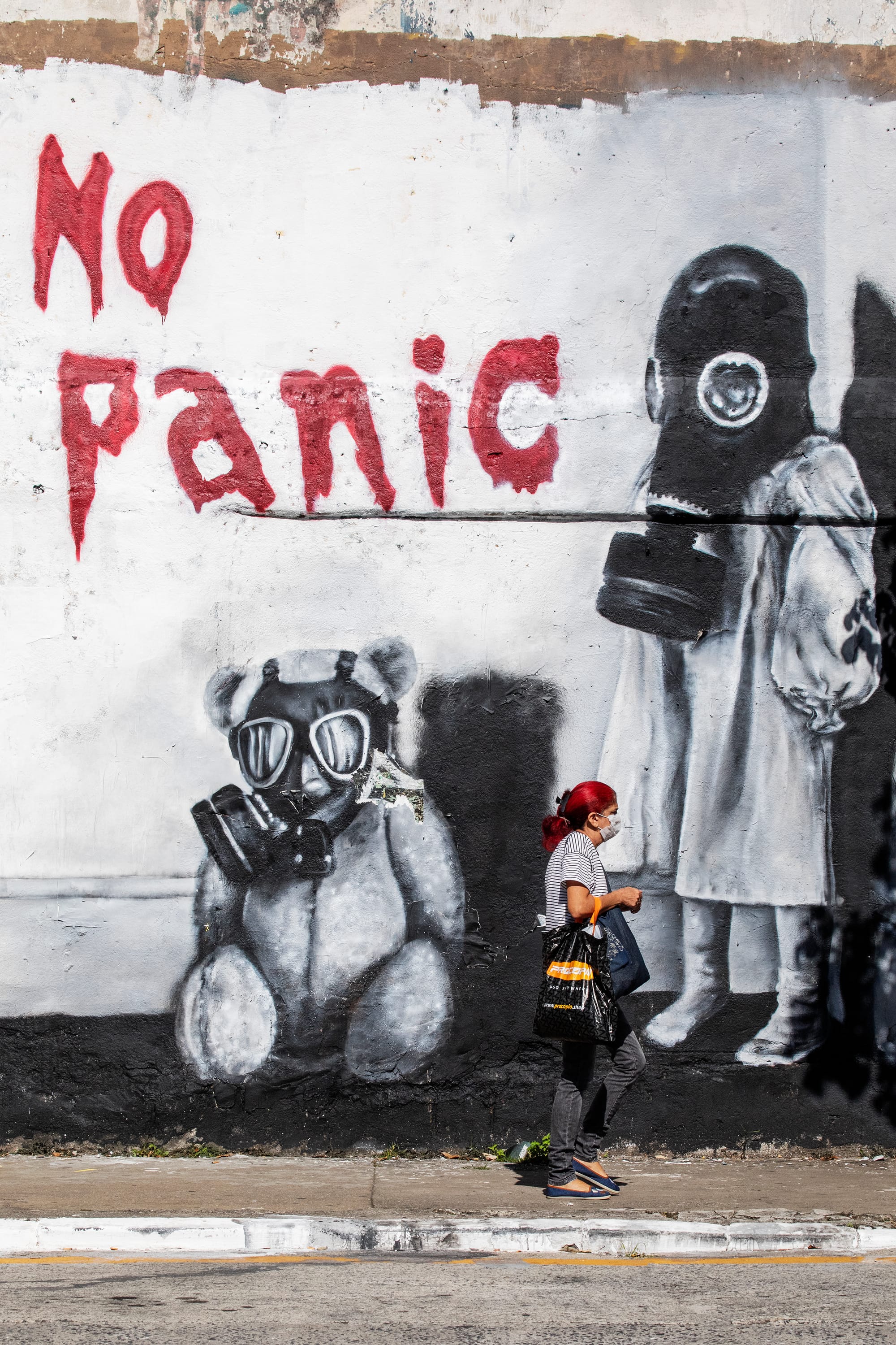 Num desses dias me deparei com esse grafite do Henrique “EDMX” Montanari. A arte me fez congelar diante dela, uma criança vestida com uma camisola de pé ao lado de um ursinho de pelúcia. Até aí tudo normal se os dois personagens não estivessem com uma máscara com o escrito em vermelho “No Panic” pairando sobre eles.