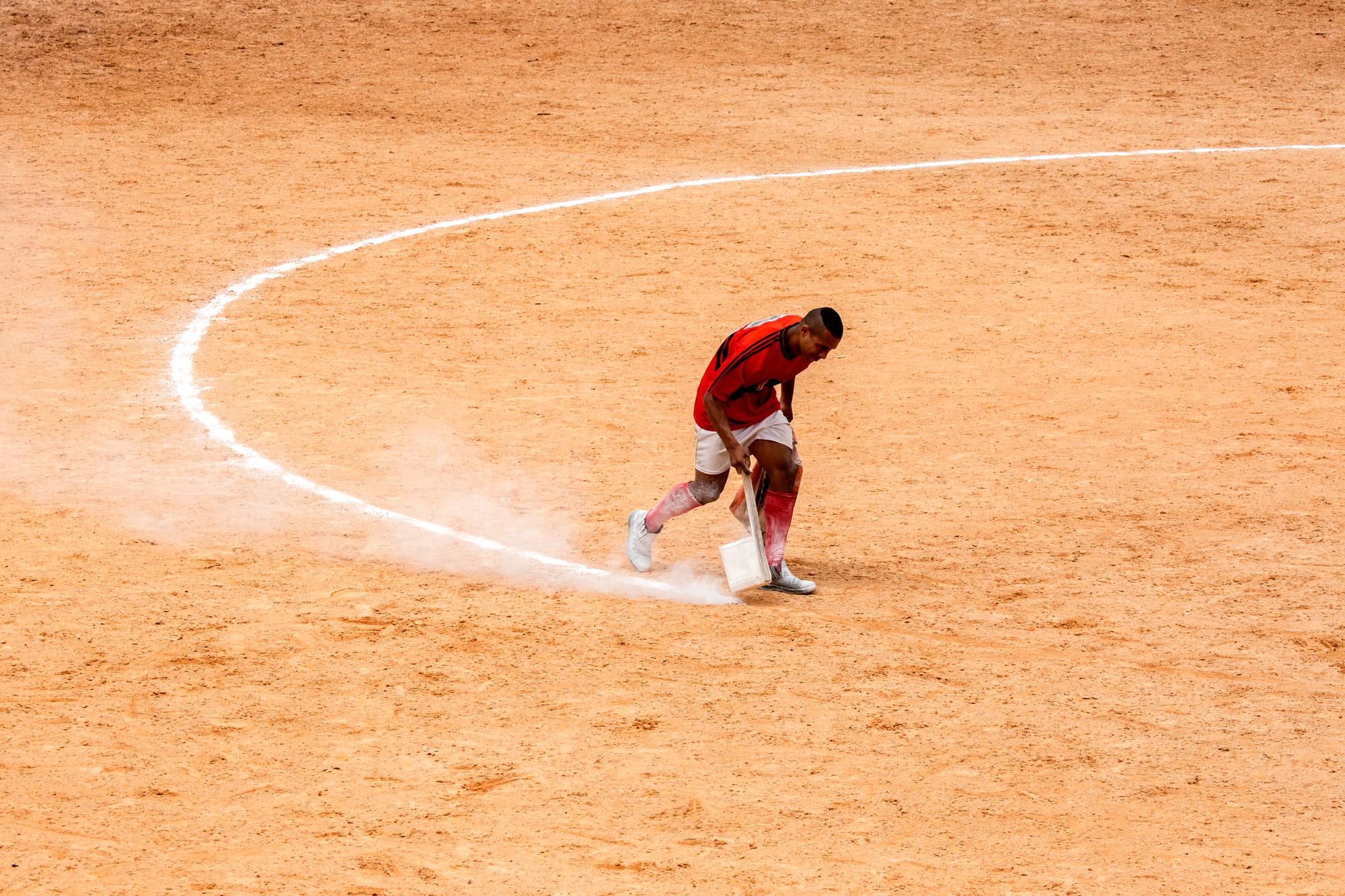 Essa foto foi feita no campo da comunidade da Xurupita, próximo ao Pico do Jaraguá em São Paulo. Eu gostava de chegar cedo, acompanhar a resenha e os preparativos para os jogos e um desses preparativos era marcar as linhas do campo com cal. Muitas das vezes, quem fazia as linhas no campo estaria jogando logo em seguida em algum time, como é o caso dessa foto.