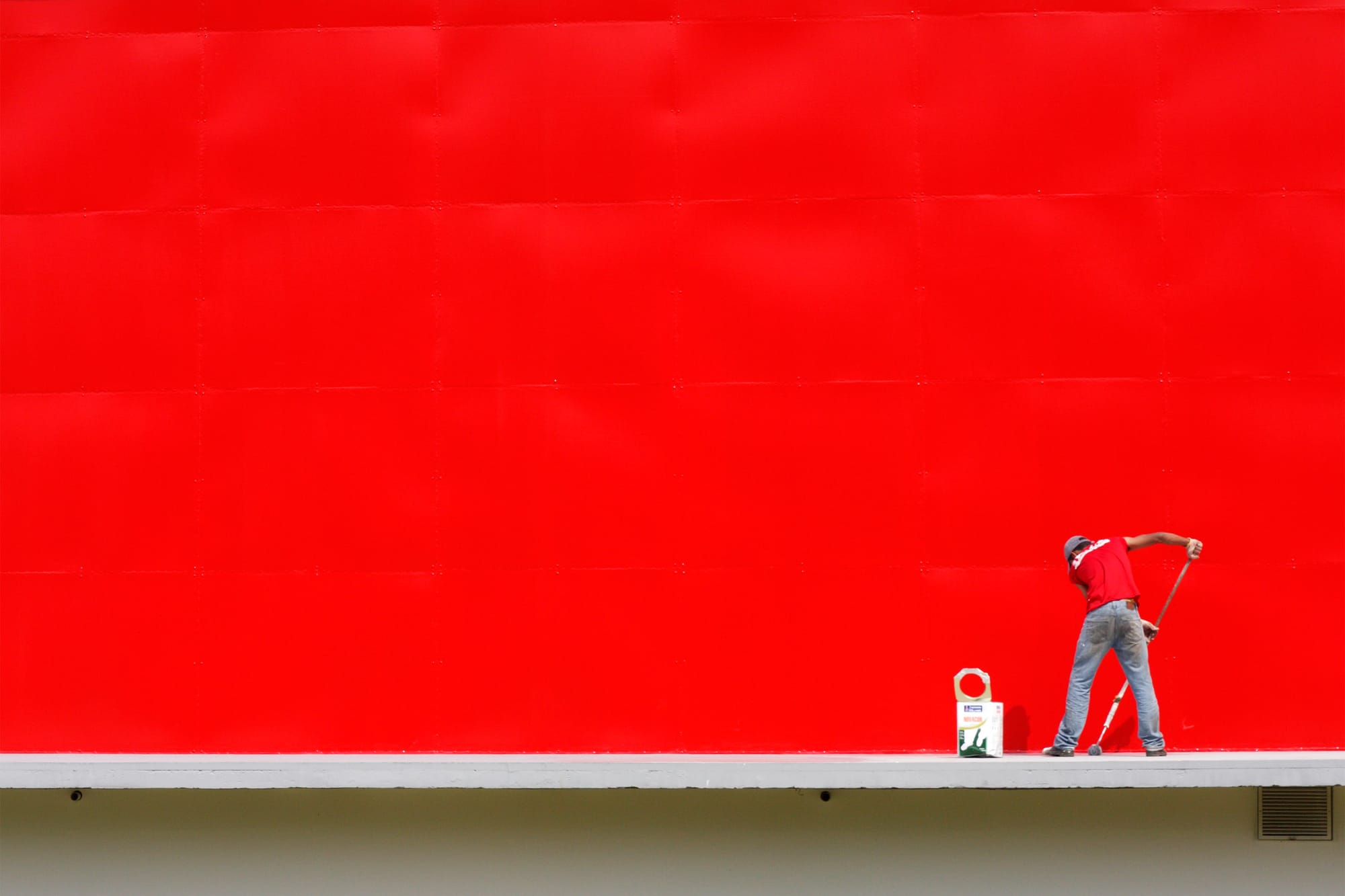 A história dessa foto não é exatamente sobre o que foi registrado, mas o que essa foto me proporcionou depois de a ter feito. A foto foi num dia que eu estava andando de bicicleta e resolvi cortar caminho pelo Parque do Ibirapuera, ao passar na frente do Auditório Ibirapuera avistei esse pintor pintando o chão, sempre ando com minha câmera na mochila, a beleza daquele vermelho da fachada recém pintada pedia uma foto e o chão cinza foi a cena perfeita para uma foto.