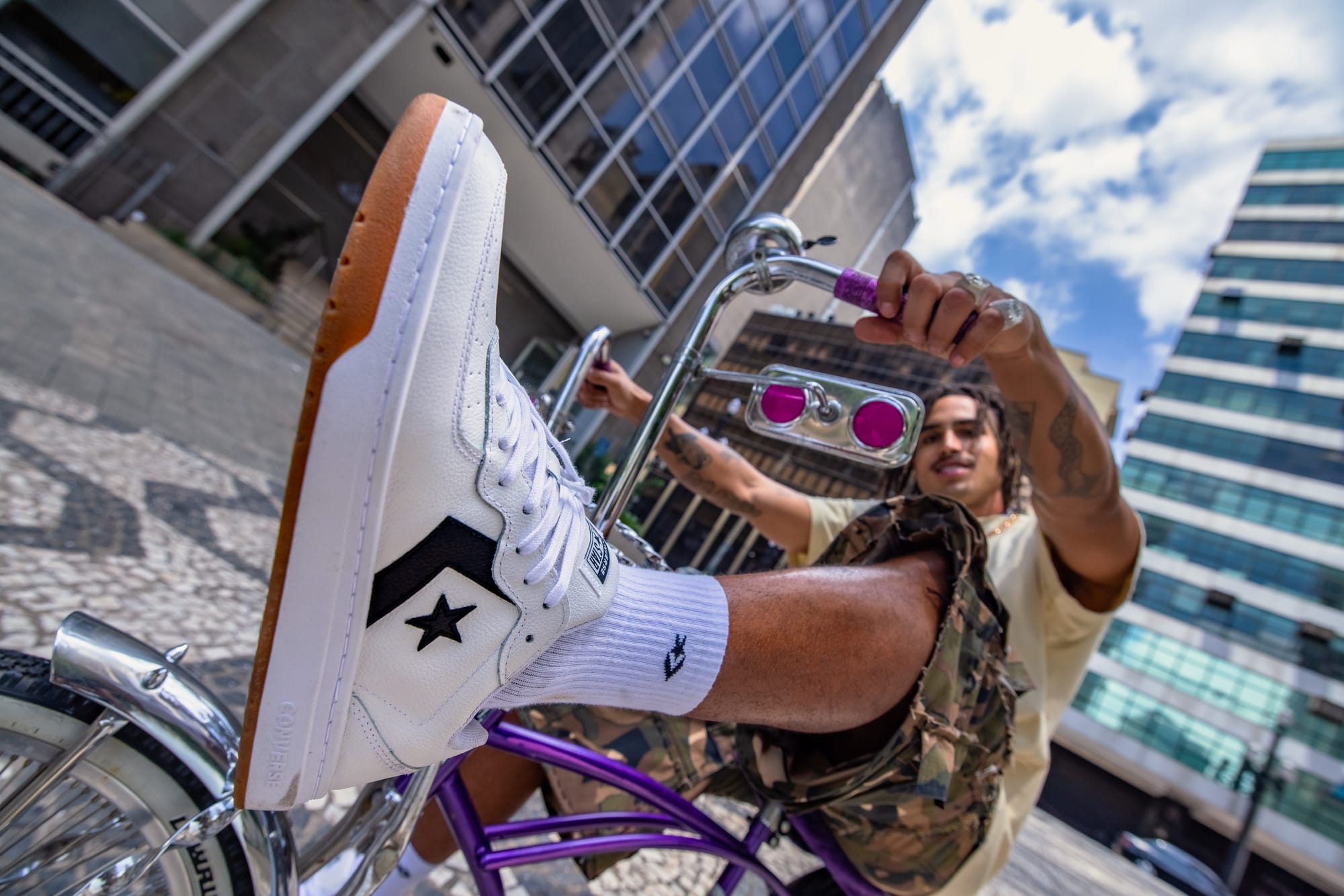 Em 2024, tive a honra de cocriar com a agência Dabba, com Tiago Moraes, Fernanda Masini, Gustavo Felipe (o Gusta), Maia, e esse momento foi mais do que desenvolver uma campanha: foi a oportunidade de imprimir minha linguagem documental em um encontro raro. A proposta reunia skatistas amadores e profissionais do time da marca Converse, com nomes potentes do rap e do trap, como Matuê e Yunk Vino. Mas, para além dos nomes, o que realmente construímos foi uma atmosfera — um espaço onde imagem, música e rua se encontraram com sinceridade.