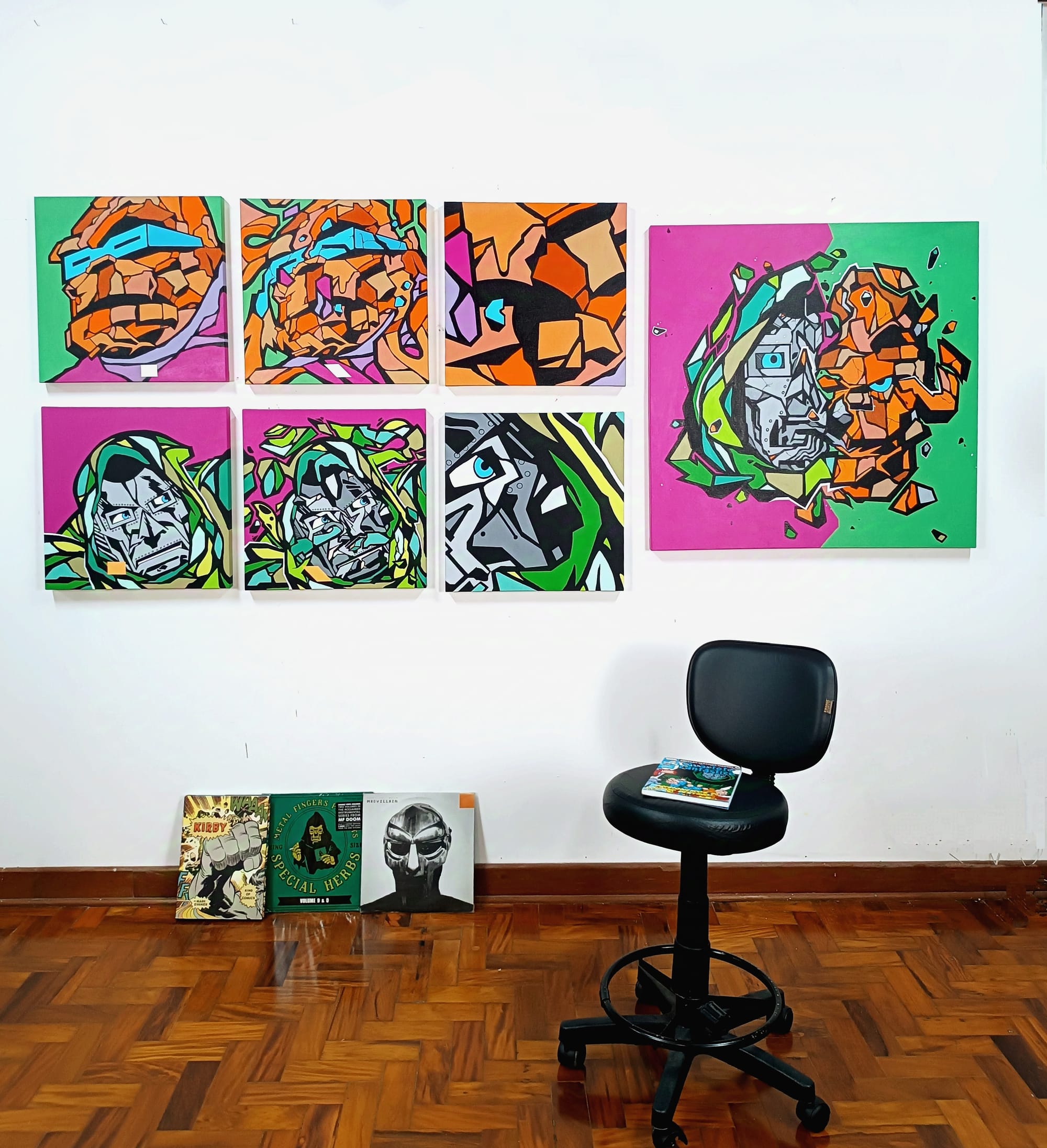 O Coisa é um super herói que eu sempre gostei e sempre quis desenhar, trazer ele pra essa minha pesquisa. O Dr. Doom é um antagonista do Quarteto Fantástico e, como fã de quadrinhos, quis criar uma história.