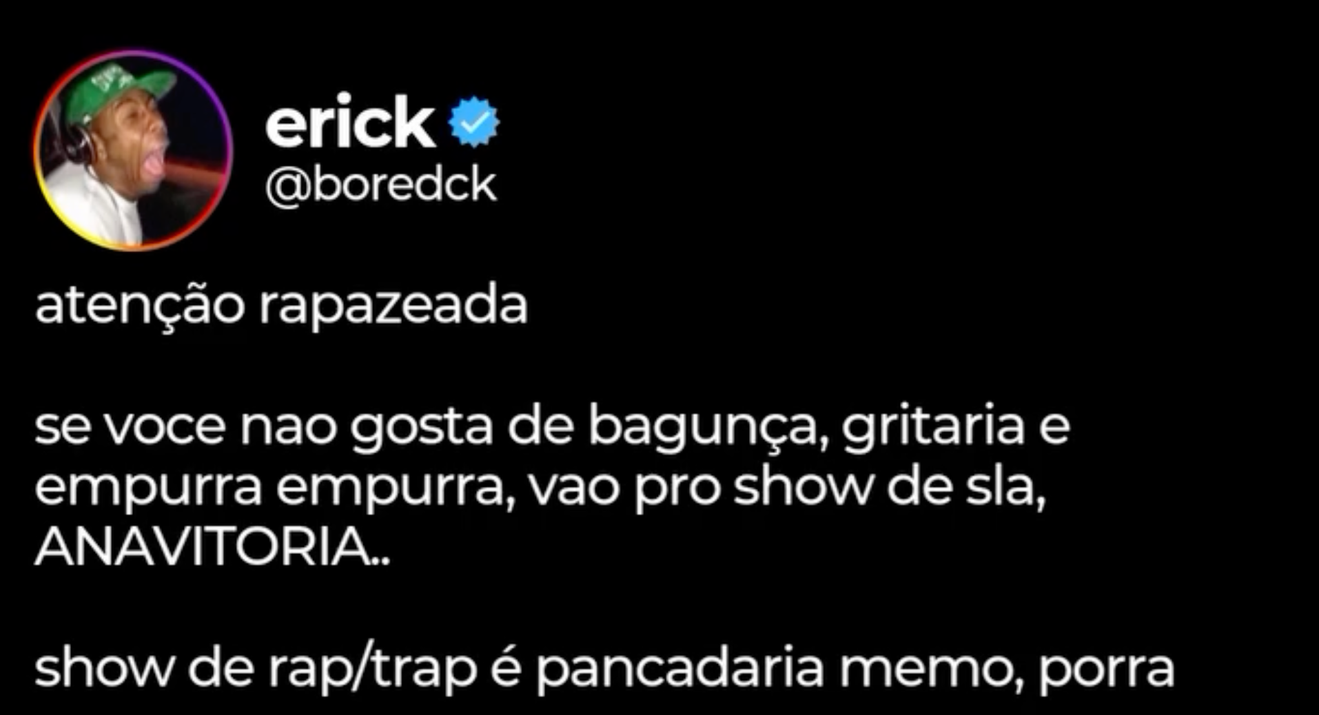 Depois do último show do trapper Don Toliver no Brasil, muita gente que colou saiu de lá reclamando que foi atingido por jovens durante os moshs, e que não respeitaram quem estava lá com criança, tinha alguma limitação, ou mesmo só queria assistir o show de boas. A discussão ganhou as redes sociais e muitos adolescentes disseram que o show era assim mesmo e quem não quisesse participar nem deveria ir ao show.