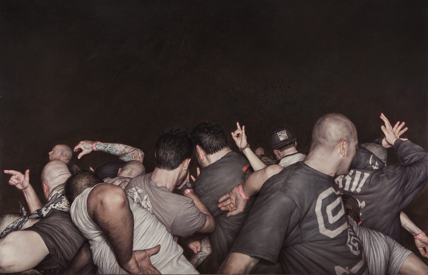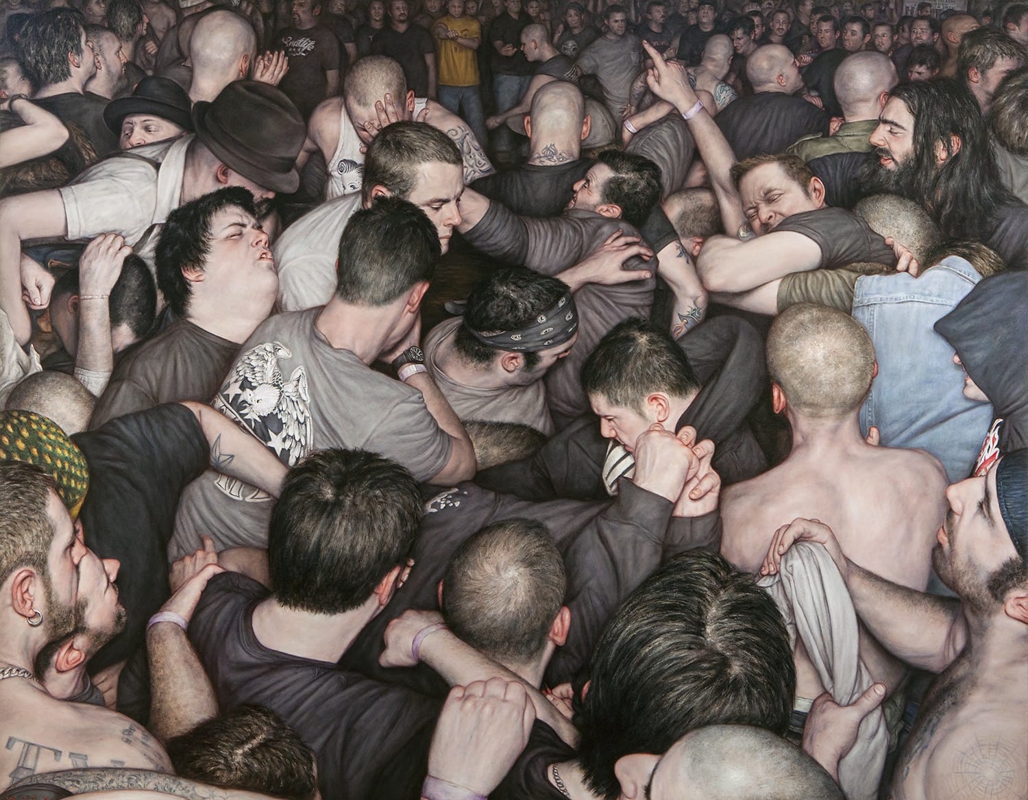 É nesse centro de colisão que o pintor norteamericano Dan Witz encontrou inspiração para uma de suas séries mais interessantes. Witz, artista referência na street art e conhecido pelos registros do cotidiano, dedicou toda uma série de seu trabalho para capturar de forma crua toda a beleza e confusão dos moshs. As pinturas feitas em tinta a óleo documentam e elevam esse momento tão simbólico para outro nível estético, ou como alguns diriam, “arte de verdade”.