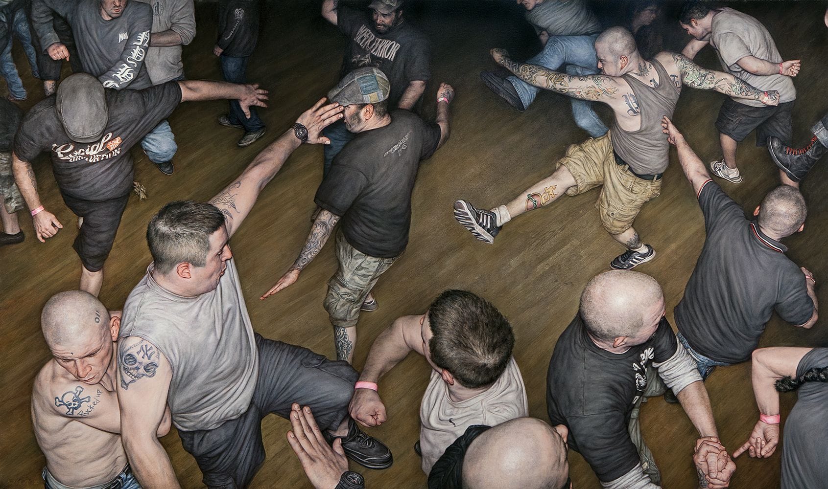 É interessante pensar que a escolha da tinta a óleo como técnica traz uma camada de profundidade para um momento que é banal, algo perceptível em outras séries feitas por Dan Witz. Para quem observa os quadros, é como se aquele instante efêmero ganhasse contornos de grandiosidade, como os quadros de momentos históricos, de grandes líderes, impérios e suas ações no tempo. E nada passa despercebido ao olhar de Dan, que pinta os detalhes do suor, os músculos tensionados, os olhos arregalados e os cabelos bagunçados no meio da roda. Se Caravaggio pintou batalhas entre humanos, anjos e demônios, Witz coloca esses personagens com moicanos coloridos, botas e jaquetas de jeans ou couro.