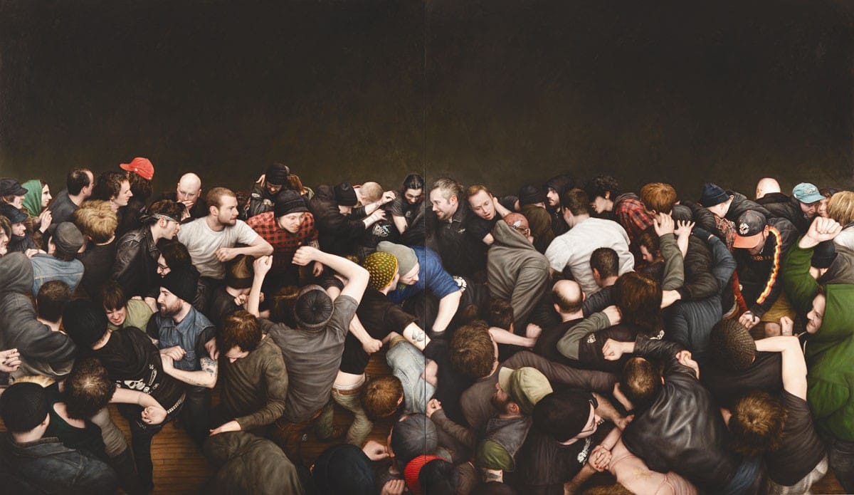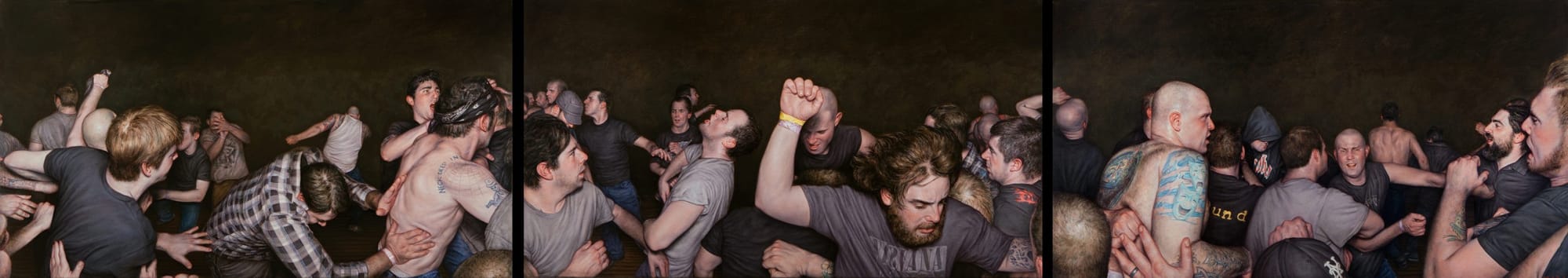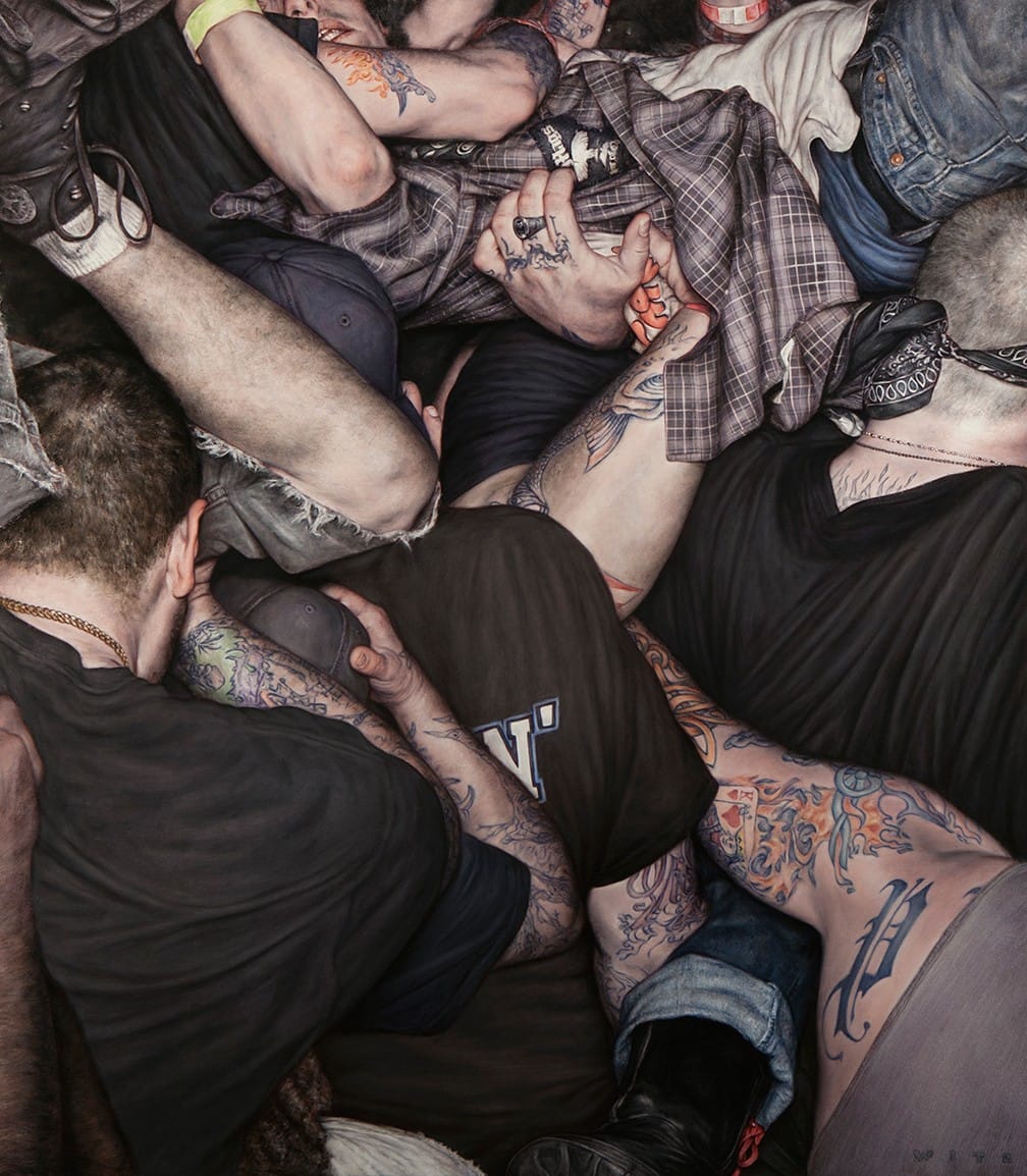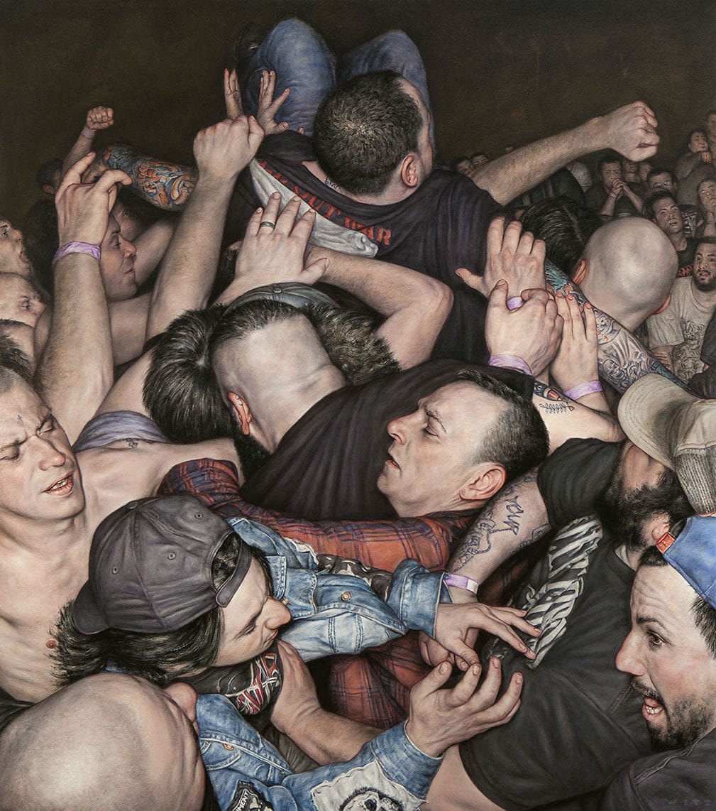 É nesse centro de colisão que o pintor norteamericano Dan Witz encontrou inspiração para uma de suas séries mais interessantes. Witz, artista referência na street art e conhecido pelos registros do cotidiano, dedicou toda uma série de seu trabalho para capturar de forma crua toda a beleza e confusão dos moshs. As pinturas feitas em tinta a óleo documentam e elevam esse momento tão simbólico para outro nível estético, ou como alguns diriam, “arte de verdade”.