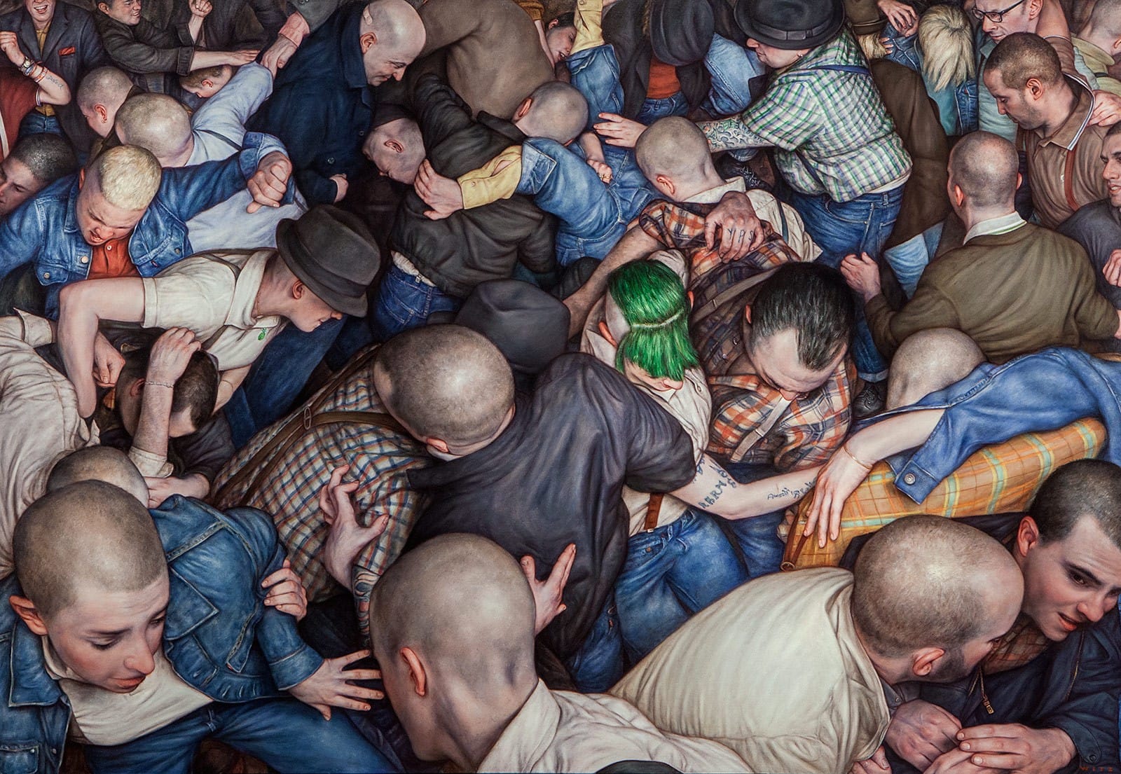 É interessante pensar que a escolha da tinta a óleo como técnica traz uma camada de profundidade para um momento que é banal, algo perceptível em outras séries feitas por Dan Witz. Para quem observa os quadros, é como se aquele instante efêmero ganhasse contornos de grandiosidade, como os quadros de momentos históricos, de grandes líderes, impérios e suas ações no tempo. E nada passa despercebido ao olhar de Dan, que pinta os detalhes do suor, os músculos tensionados, os olhos arregalados e os cabelos bagunçados no meio da roda. Se Caravaggio pintou batalhas entre humanos, anjos e demônios, Witz coloca esses personagens com moicanos coloridos, botas e jaquetas de jeans ou couro.