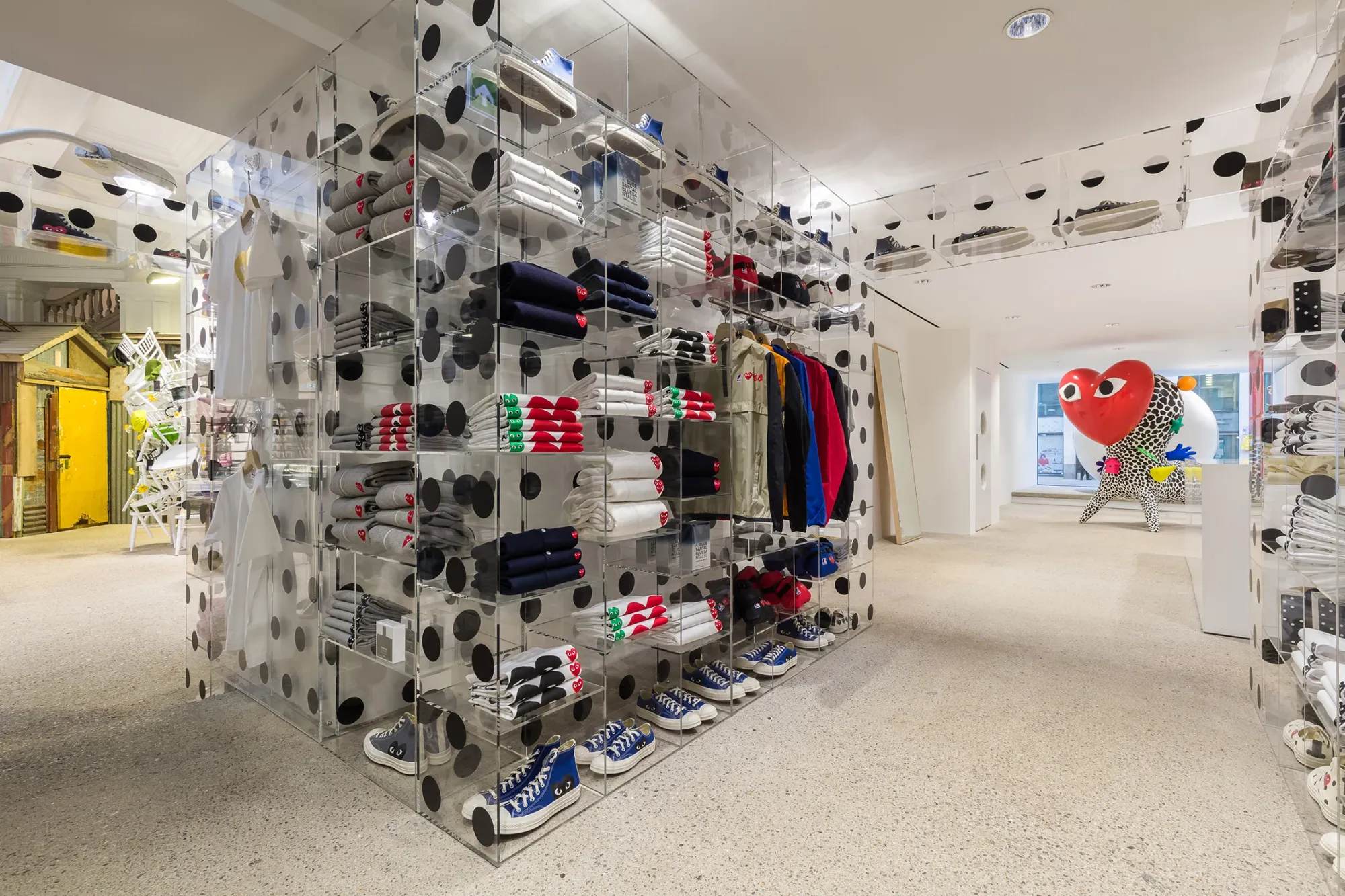 Um bom exemplo é a Dover Street Market Ginza, loja-conceito criada por Rei Kawakubo, fundadora da Comme des Garçons. O espaço ocupa um prédio de sete andares no centro de Tóquio, e cada andar é tratado como um capítulo visual, com instalações que mudam com frequência. Não se trata de organizar produtos por categoria ou preço, mas de criar narrativas espaciais em que cada marca habita seu próprio mundo.