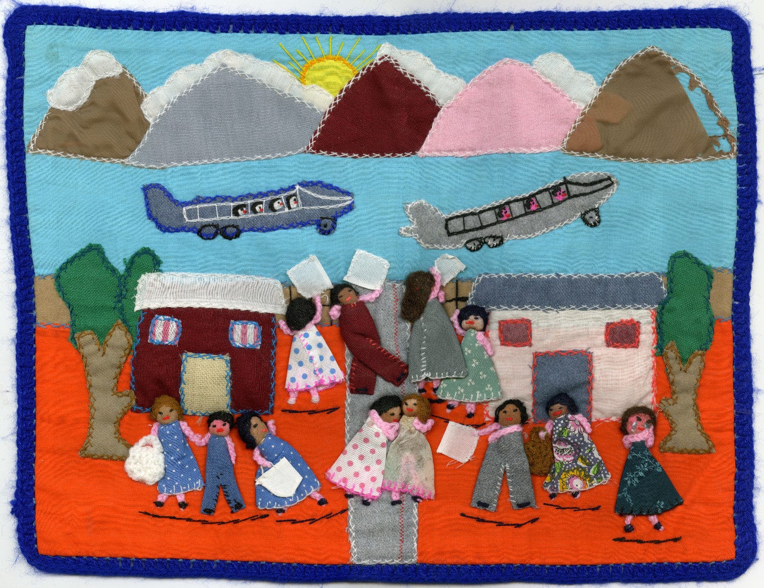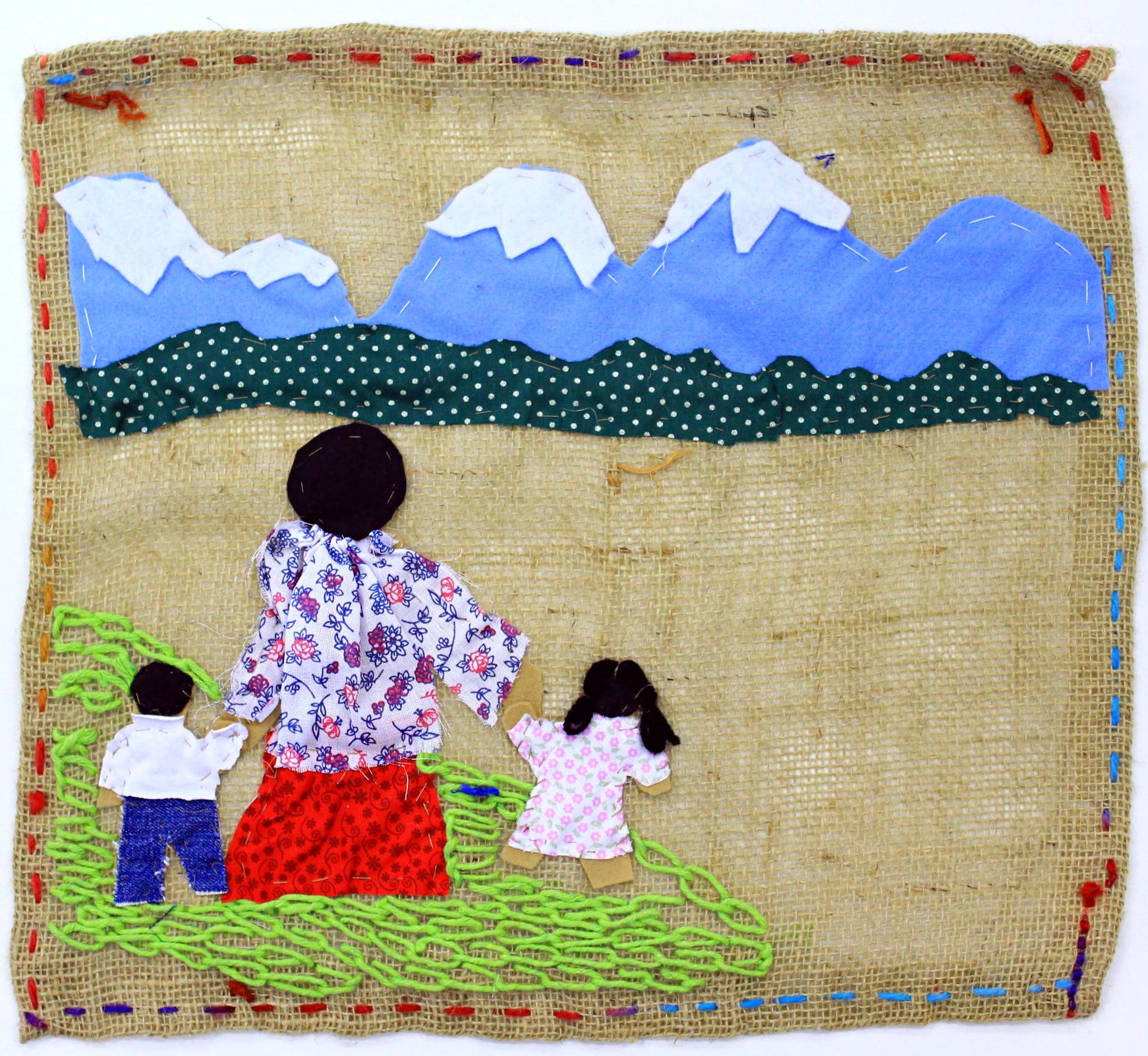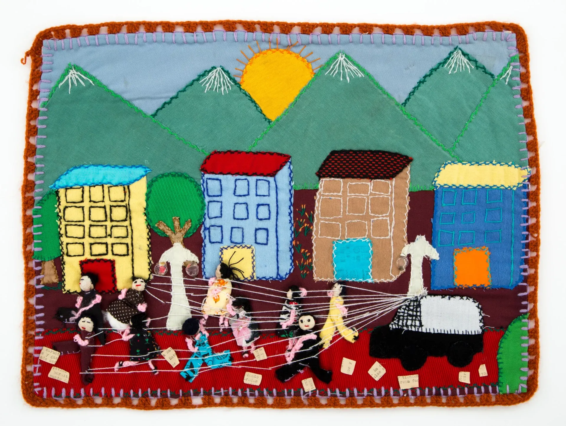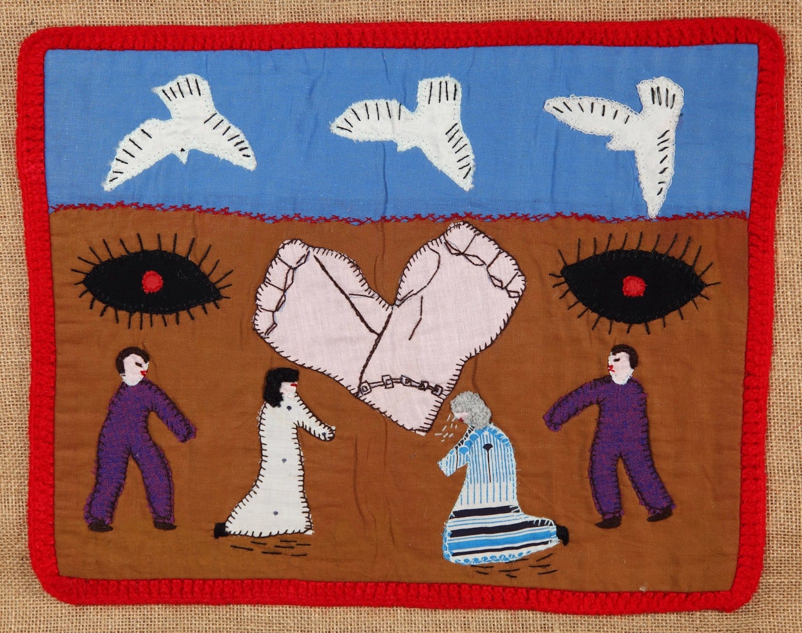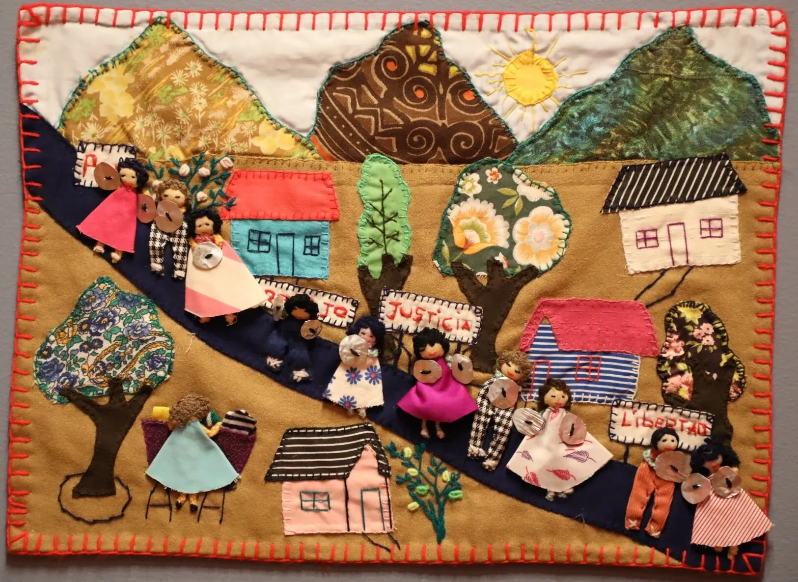 A estética dessas obras nasce da escassez. O suporte geralmente vinha de sacos de farinha ou batata cortados, enquanto os bordados eram feitos com retalhos reaproveitados. Em muitos casos, esses pedaços de tecido pertenciam às roupas dos próprios desaparecidos, incorporando literalmente a memória física dos entes queridos à obra. Além do bordado e do aplique, algumas arpilleras incluem elementos tridimensionais, como pequenas bonecas de pano que se projetam para fora da superfície, dando relevo às cenas e reforçando a dimensão humana do que está sendo narrado. Cada ponto carrega tempo, insistência e afeto. Bordar, aqui, é também um gesto de luto e de permanência.