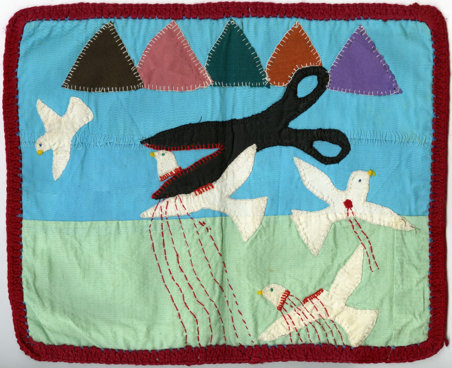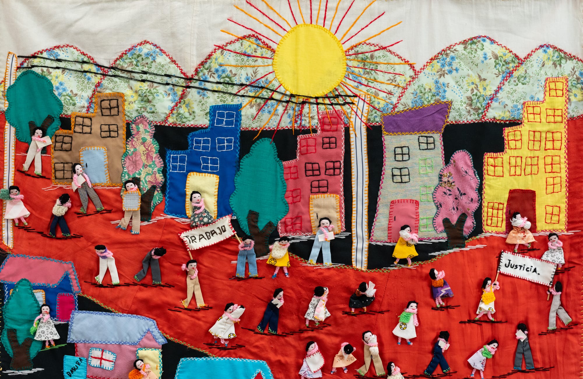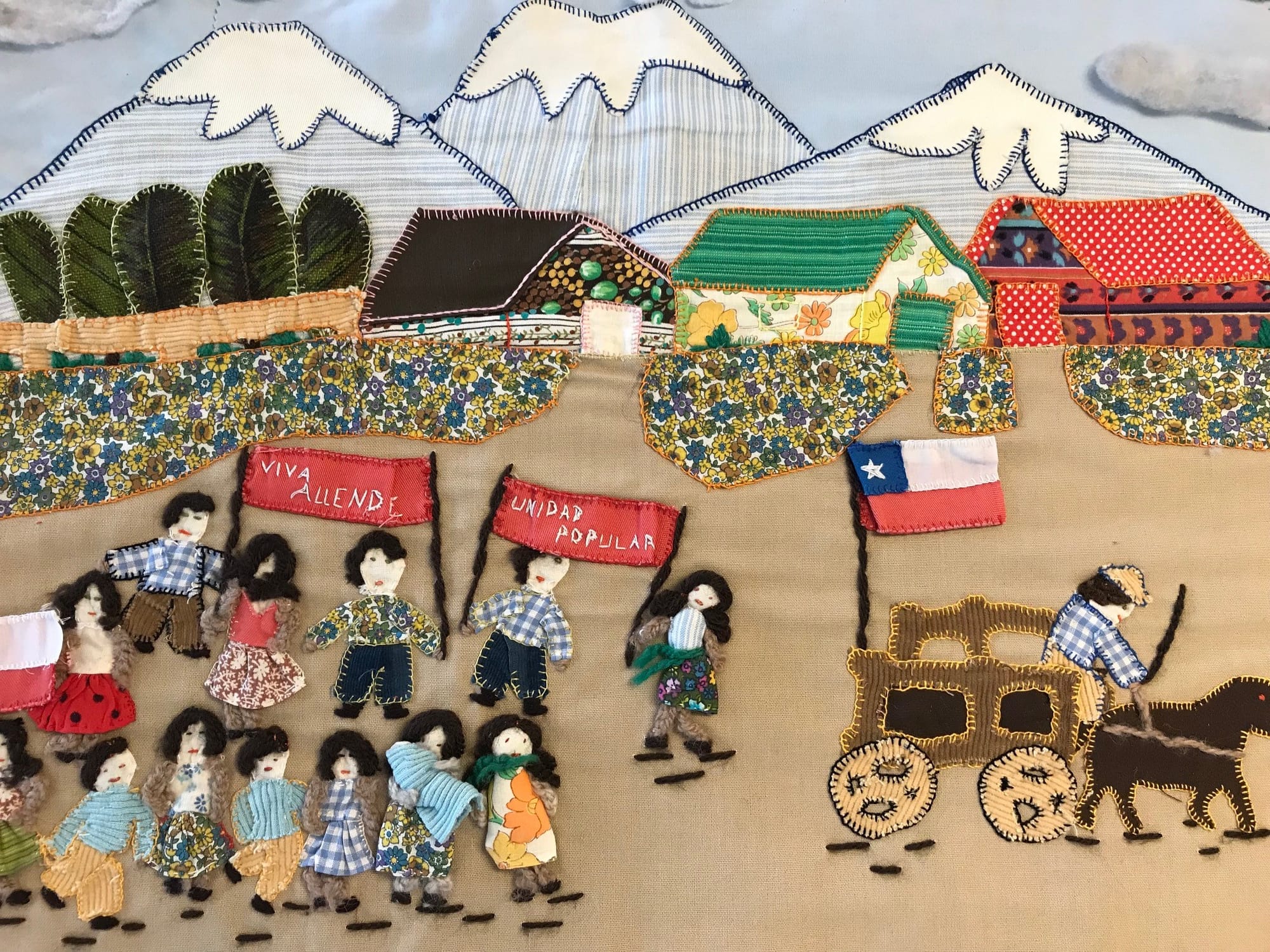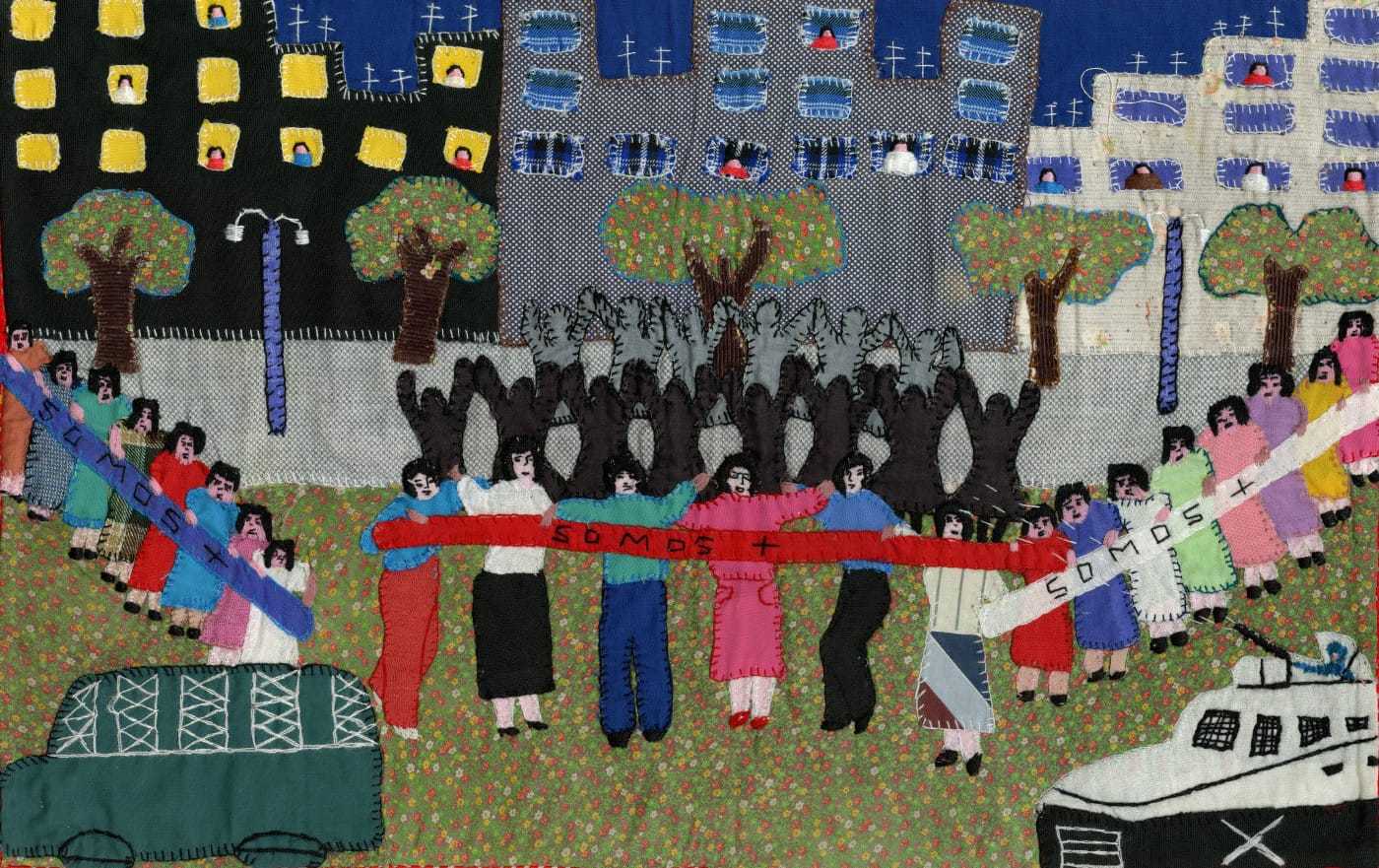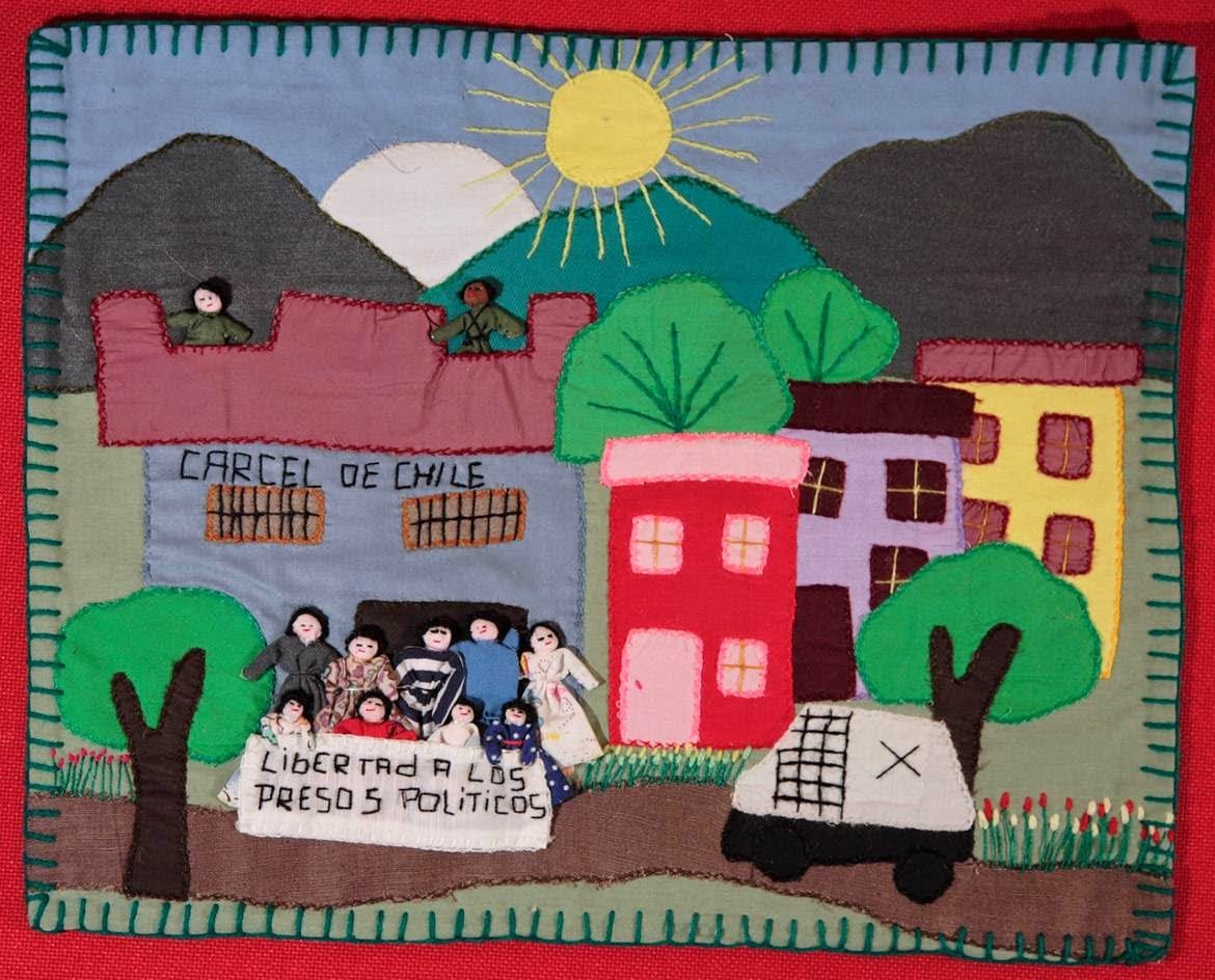 Essas peças ganham força a partir dos anos 1970, em pleno regime de Augusto Pinochet. Diante da censura, da repressão e do silêncio imposto pelo Estado, grupos de mulheres passaram a se reunir em oficinas coletivas para compartilhar suas dores e registrar aquilo que não podia ser dito publicamente. Muitas dessas iniciativas contavam com o apoio da Vicaría de la Solidaridad, ligada à Igreja Católica, que oferecia abrigo, articulação comunitária e meios para que as obras circulassem dentro e fora do país. As mulheres envolvidas eram, em sua maioria, mães, esposas e filhas de presos políticos e desaparecidos. Sem acesso à justiça ou aos meios formais de denúncia, encontraram no bordado uma forma de resistência e também uma maneira de garantir alguma subsistência.