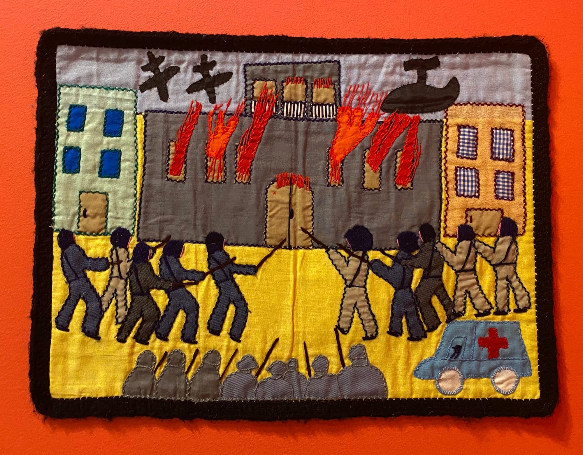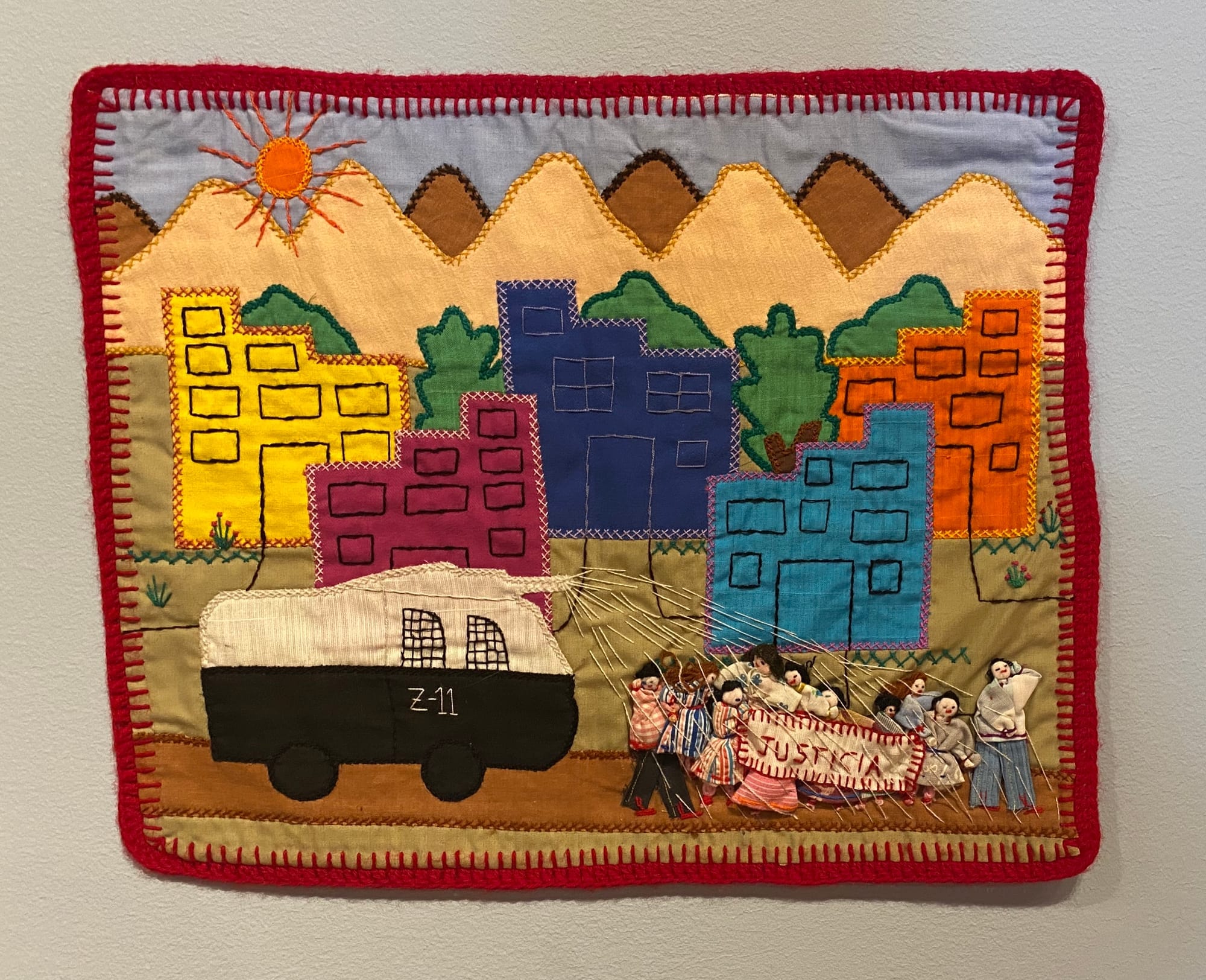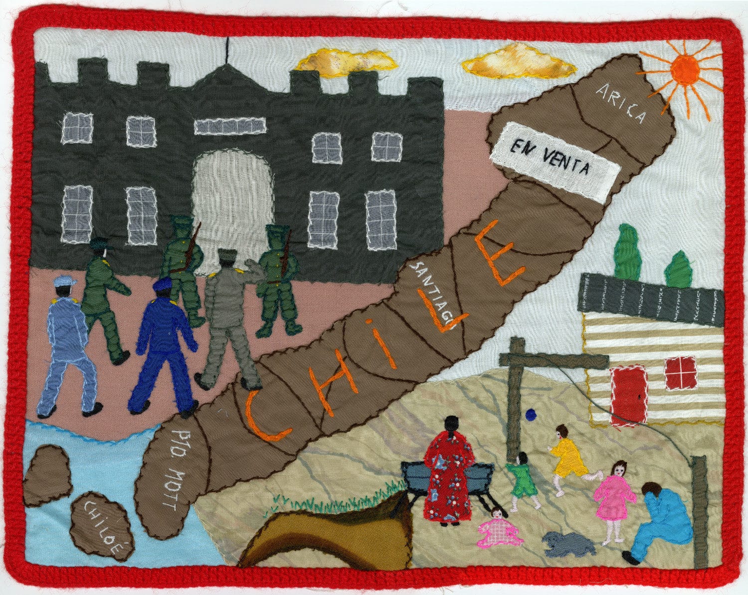 As cenas retratadas nas arpilleras não recorrem à abstração. Elas mostram o que estava acontecendo. O bombardeio do Palácio de La Moneda, prisões arbitrárias, torturas, desaparecimentos forçados, fome, filas por comida, mulheres e crianças em busca de familiares. O cotidiano atravessado pela violência de Estado aparece costurado em pequenas narrativas visuais, diretas e difíceis de ignorar. Essa frontalidade é parte central da força das arpilleras. Elas não explicam. Elas mostram.