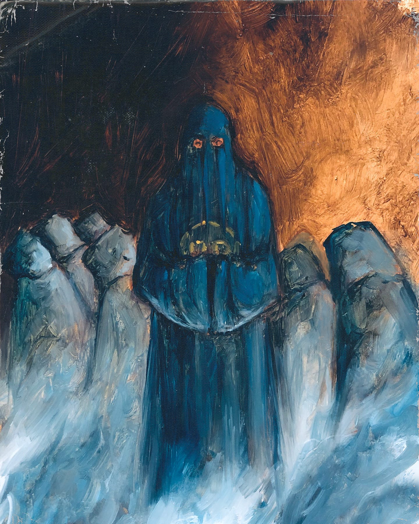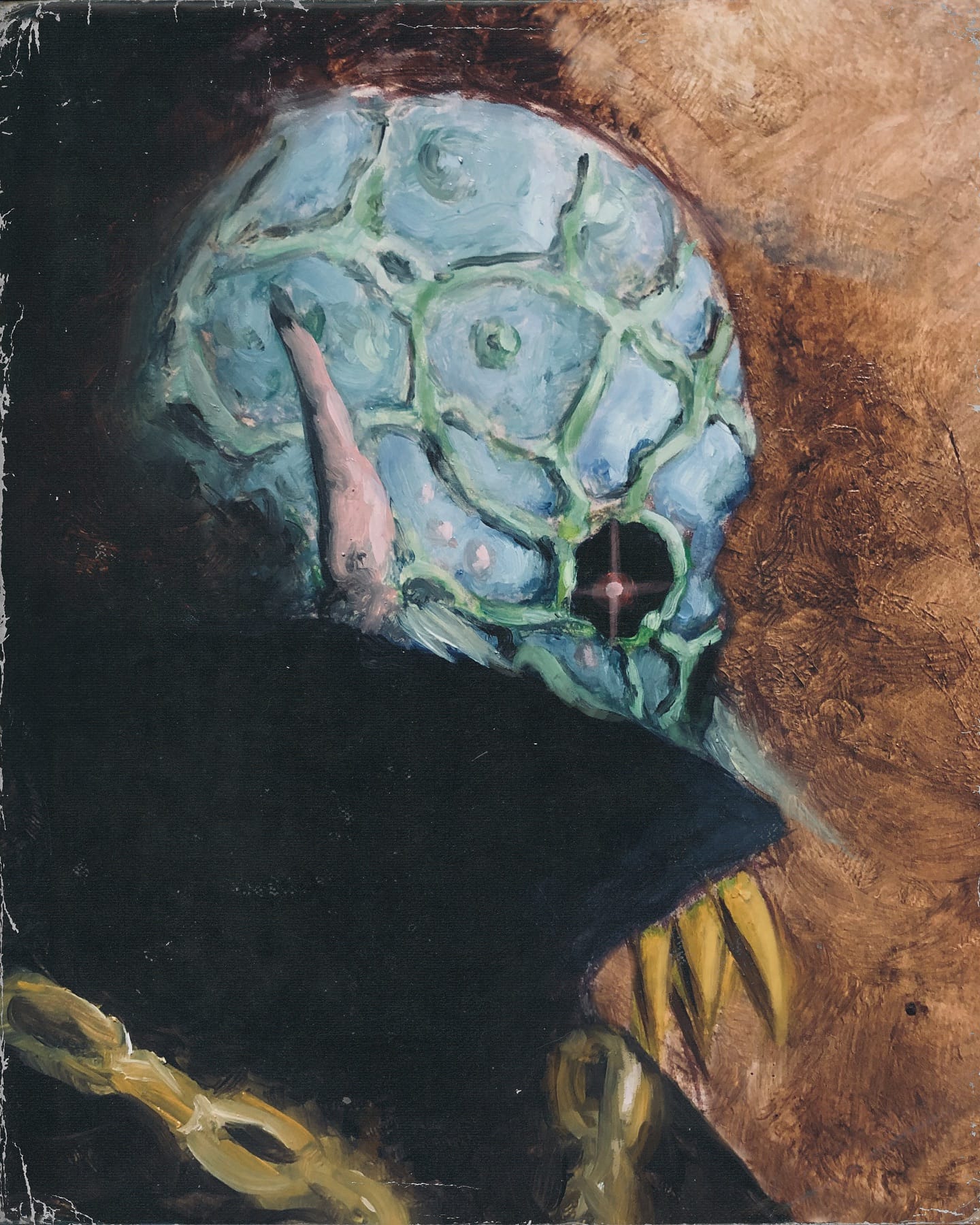 Acabei voltando para a acrílica para pintar telas maiores e fazer outras coisas. Nessas eu também comecei a pintar a óleo para imitar as capas de terror dos anos 80 e por conta disso comecei a estudar anatomia, porque as pessoas nas capas eram pessoas muito bem feitas! Todos esses estudos foram por conta própria, sempre intercalando com quem pinta com o que. Exemplo, John Sargent, Van Dyck… Eu era um cara com internet e vontade de aprender! Eu comecei no metal, mas hoje me influencio por caras mais realistas, naturalistas.