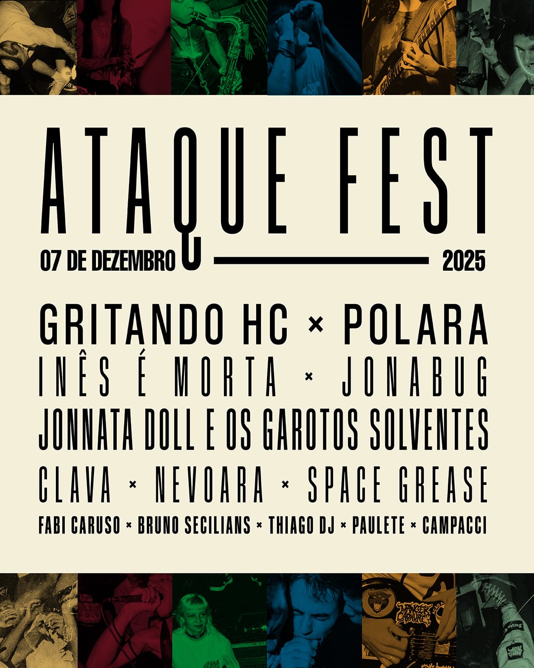 Lineup Ataque Fest 2025: Gritando HC, Polara, Inês é Morta, Jonabug, Jonnata Doll e Os Garotos Solventes, Clara, Nevoara e Space Grease.