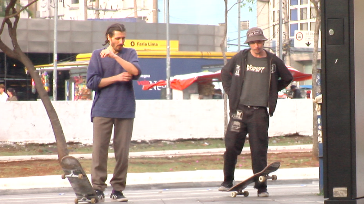 Outra coisa que rolou foi colocar uma brincadeira de “mesma trick, mesmo spot, mesmo ângulo”, com dois skatistas no mesmo vídeo, do Trakinas e o Renato Segato, um bigspin na Avenida Angélica.
