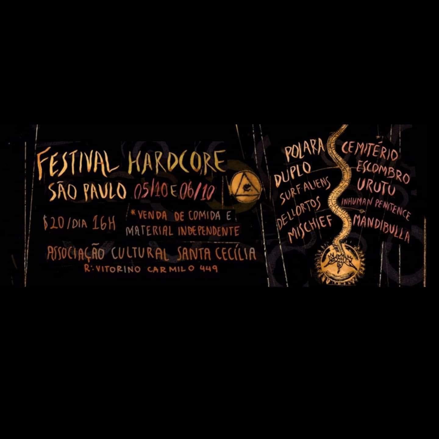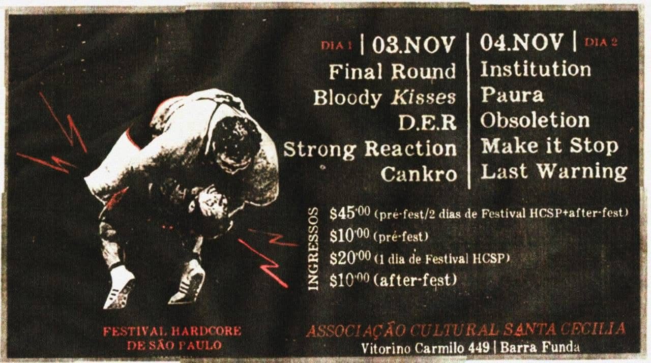 Nos dias 11 e 12 de outubro de 2025 acontece mais uma edição do Festival Hardcore São Paulo, desta vez na Santa Cecília. O festival rola desde 2016, inspirado por outros rolês fora do país. Segundo Daniel Lopes, o Azeitona, um dos organizadores do festival, a ideia surgiu depois que ele foi acompanhar os amigos do Stomp tocar na Europa: “a gente foi no Leper, na Belgica, tocando com uma par de banda da hora e foi pegando a inspiração pra fazer um festival nosso por aqui”.