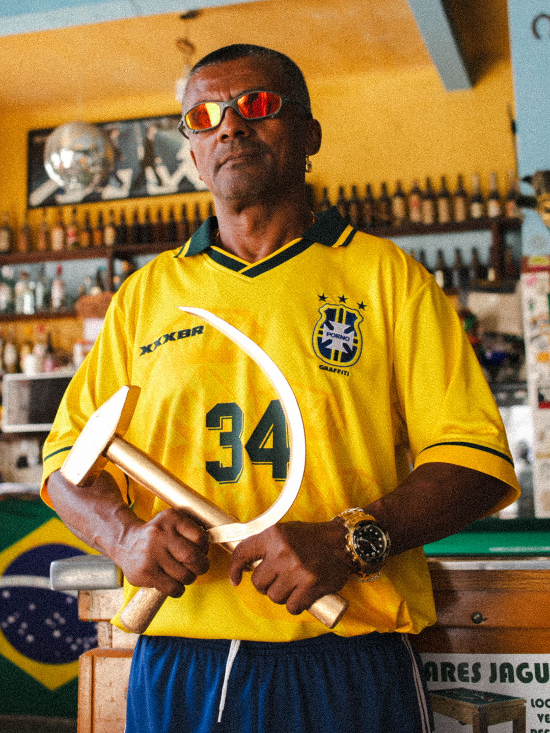Para a campanha, o projeto convidou o Romário Sósia, para representar o ícone da conquista do tetra e figura pra lá de controversa, agora em versão comunista. Nas costas, o 11 do baixinho foi substituído pelo número 34, em referência ao nome químico do MDMA: 3,4metilenodioximetanfetamina, tudo isso apresentado na estética de boteco, ambiente que também respira futebol, política e, por que não, festa.