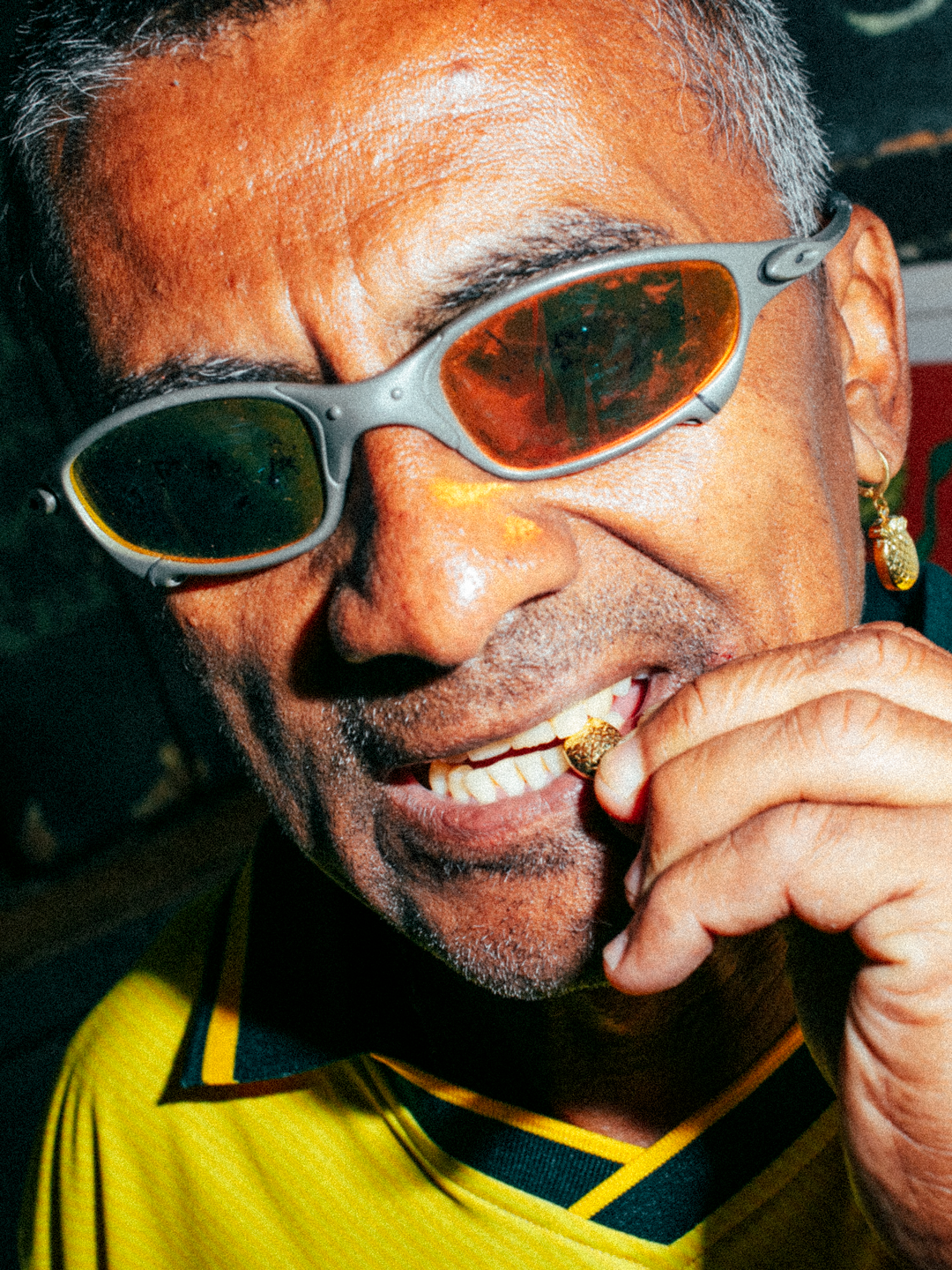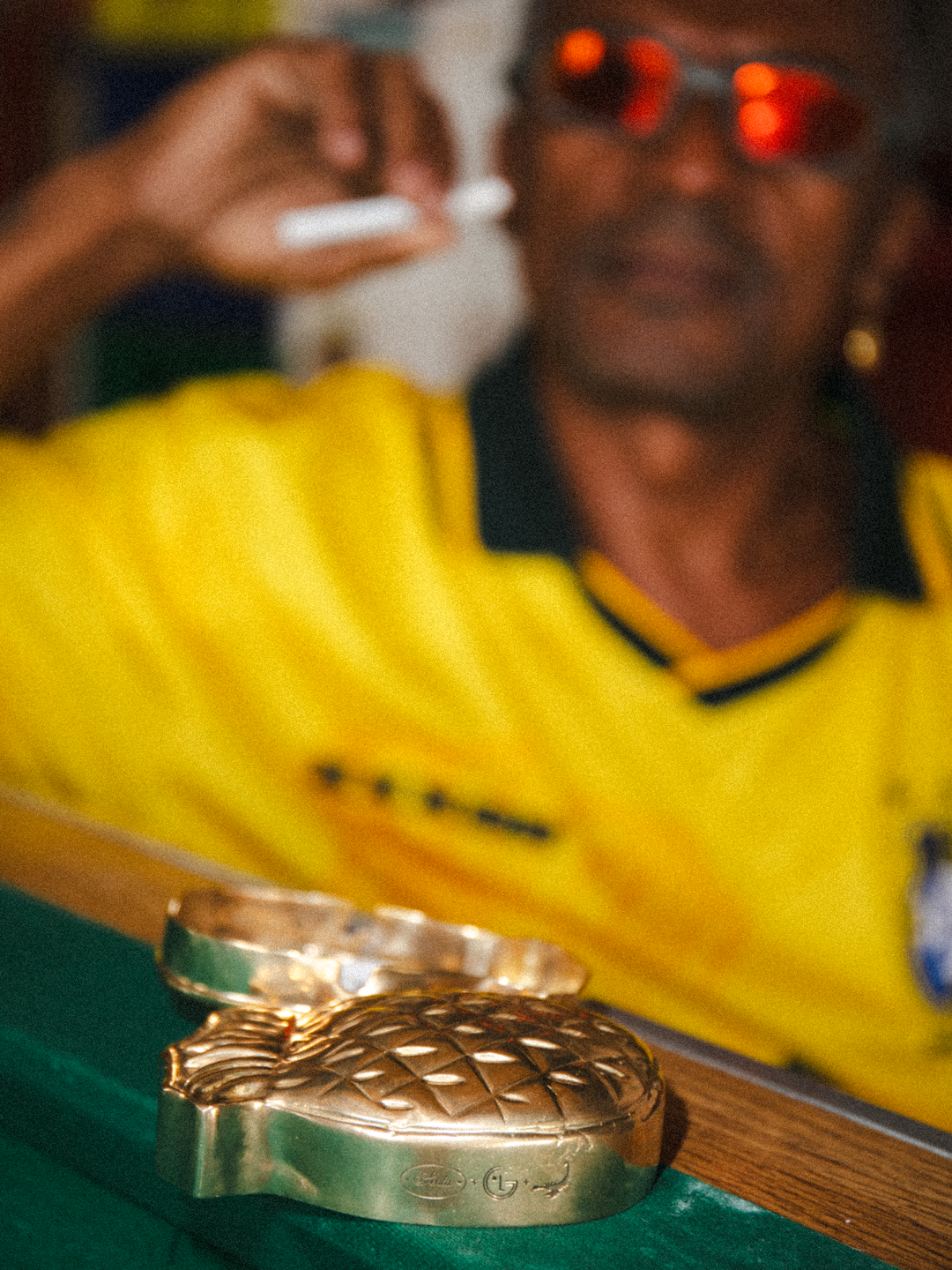 A marca, que já é conhecida pelos projetos de humor ácido e fortemente posicionados, aproveitou o momento para conectar o mundo das pistas e dos campos, tendo a bala (ecstasy) abacaxi como elemento central. A droga, em formato de fruta, viveu o auge na retomada das ruas após a pandemia e virou símbolo desse novo momento de liberdade. Na coleção ela aparece substituindo os escudos triplicados da CBF, famosos pela campanha do tetra mundial, além de aparecer também em outros itens como um cinzeiro produzido em latão, um brinco e um chaveiro.