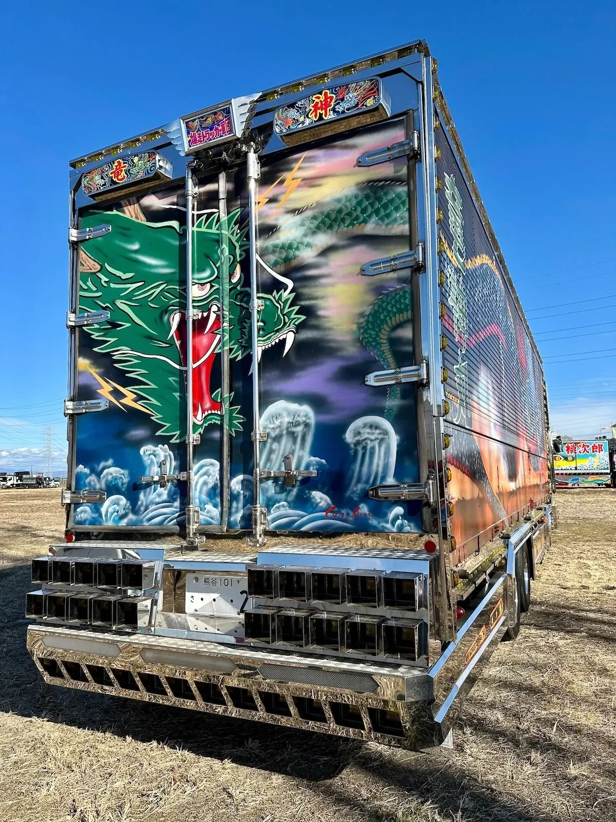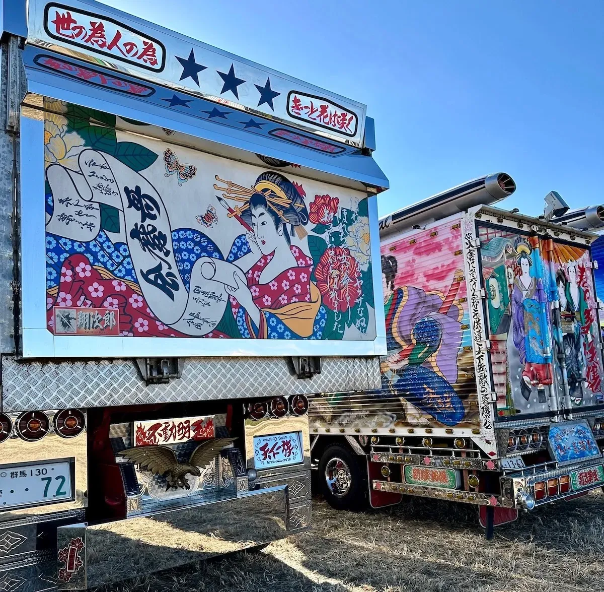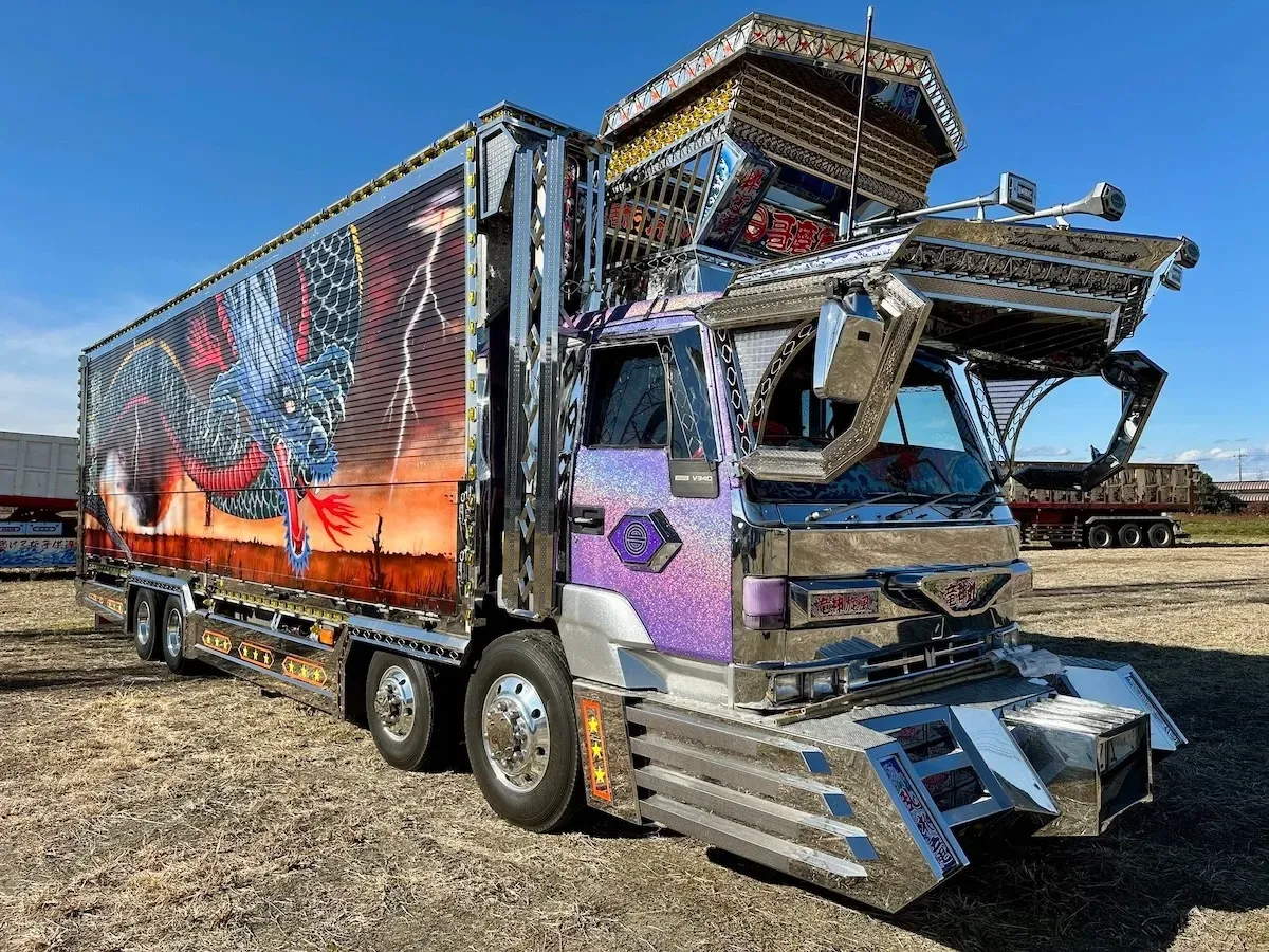 O visual dos caminhões é exagerado, mas meticulosamente pensado. Lanternas, neons, estruturas cromadas e esculturas metálicas reluzentes se combinam com pinturas detalhadas que vão do folclore japonês a personagens de anime, passando por paisagens inspiradas na arte tradicional. A estética é kitsch, maximalista, mas também profundamente artesanal. Cada caminhão é um projeto único, construído ao longo de anos. Seus donos chegam a investir somas impressionantes, às vezes ultrapassando centenas de milhares de dólares, para transformar cada veículo em uma obra de arte única.