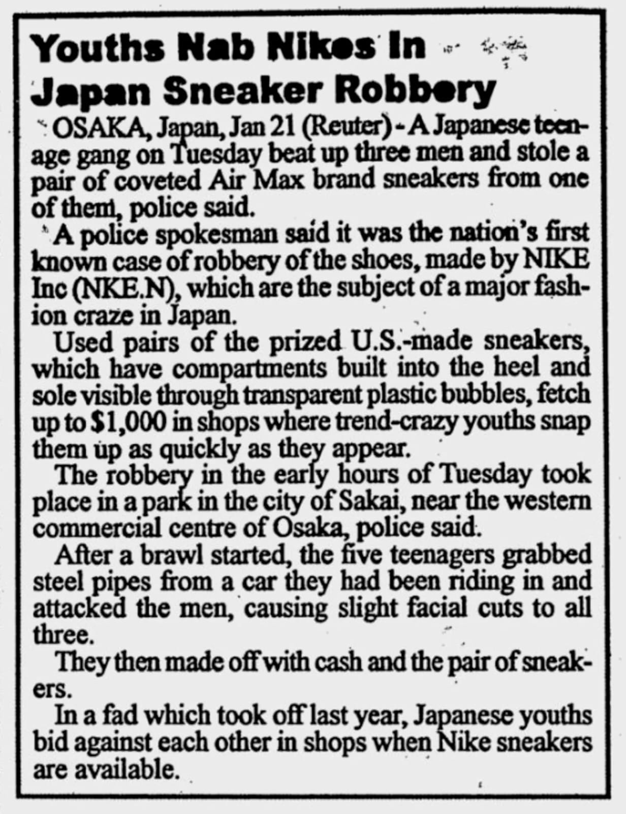 Em 1996, na cidade de Osaka, um caso chamou a atenção da imprensa japonesa: um grupo de adolescentes atacou violentamente outro jovem para roubar o que ele calçava. Não era dinheiro, nem status material óbvio - era um par de tênis Air Max 95, recém-lançado no Japão e já disputado nas ruas. A agressão foi tão marcante que a polícia passou a registrar casos similares sob o nome de "Air Max Gari" (algo como "caçada ao Air Max").