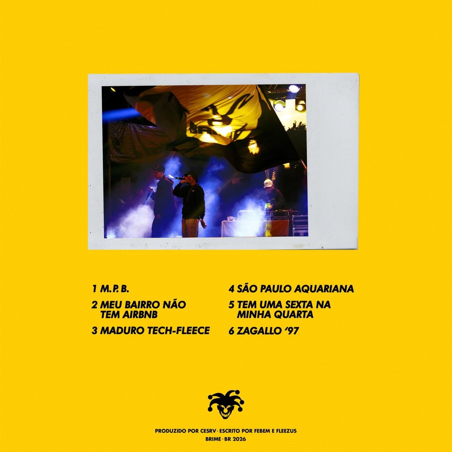 BRIME!! foi lançado hoje, 01/04, seis anos depois do primeiro volume. O EP é sequência do projeto lançado em 2020 por Febem, Fleezus e CESRV, e é composto por seis faixas inéditas, que expandem o universo sonoro de BRIME! fazendo uso das mesmas estratégias que já apareciam no primeiro volume — diversos subgêneros da música eletrônica global trazidos para o nosso contexto, reinterpretados, com a intenção de criar uma sonoridade verdadeiramente autêntica e independente.