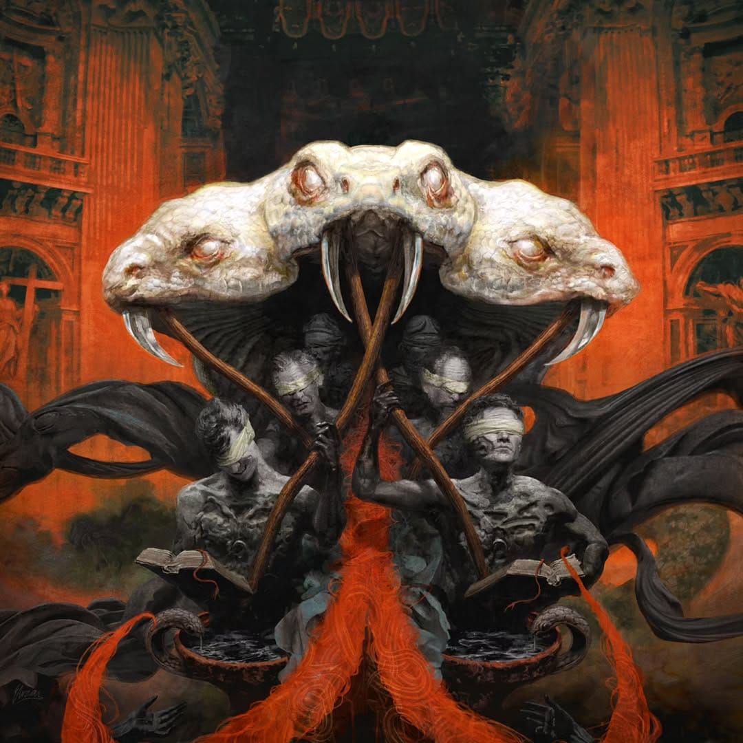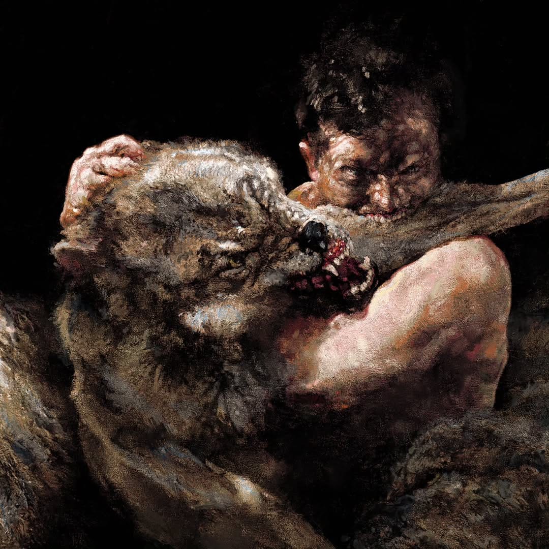 A relação de Eliran com o Thy Art is Murder, Malevolence e Fit for an Autopsy também vai além de uma capa só, com os artistas colaborando em diversos projetos. Um ponto de convergência dessas contribuições é o lobo, que aparece em Dear Desolation (2017) do Thy Art is Murder e nesse split com o Malevolence e o Fit for an Autopsy de 2023. Um lobo e um humano numa treta sinistra, mas que na real foi inspirado numa mordida que rolou no jardim de infância do filho dele, segundo o próprio relato do artista no seu instagram.