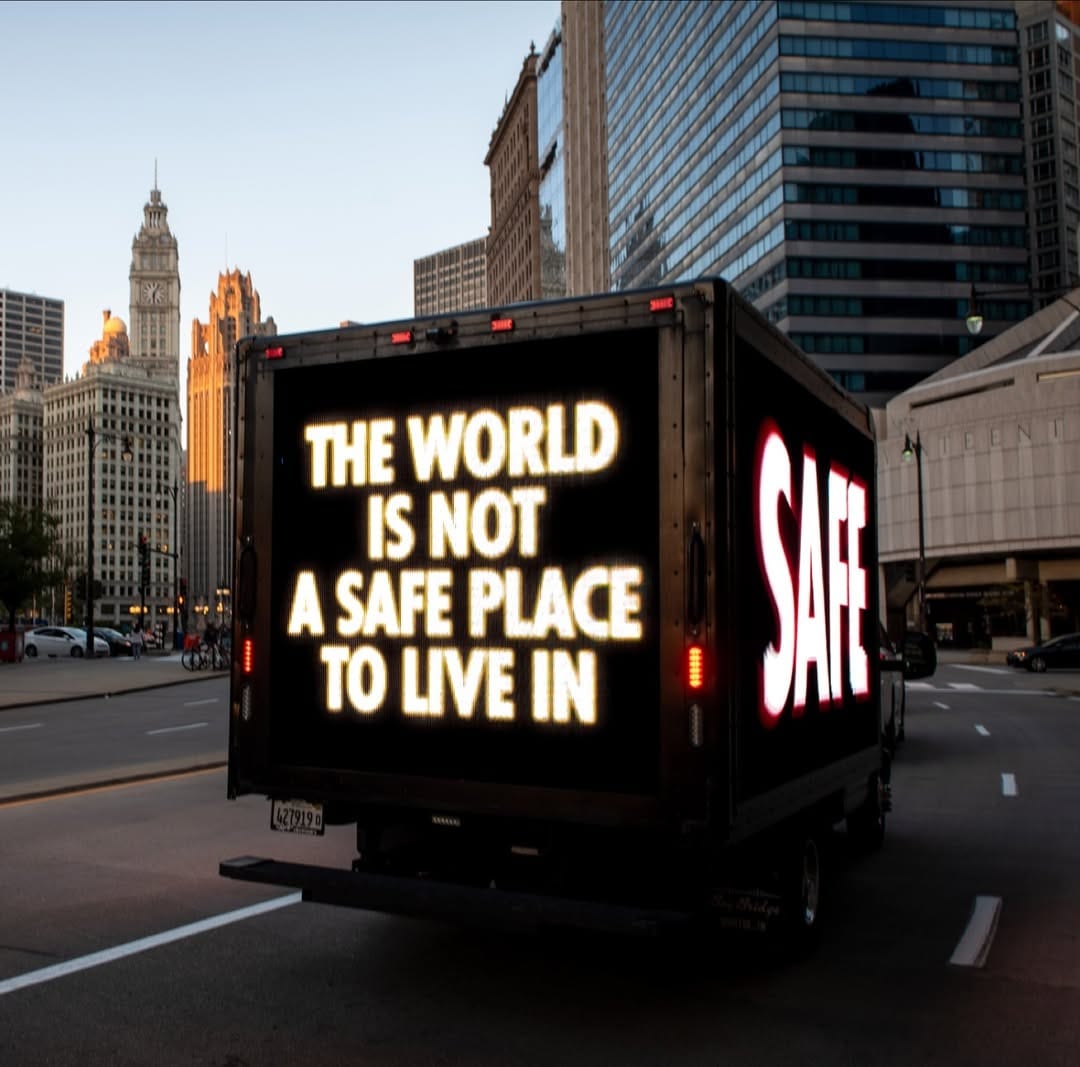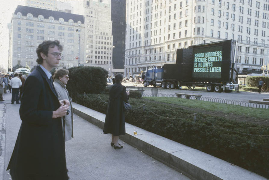 Com os paineis de LED, outra ideia viria seguir esse desejo de ter sua arte espalhada por mais lugares. A série Sign on a Truck, que começou em 1984, é uma que acompanha a artista até hoje e começou em um tenso momento político americano e teve participação de artistas convidados como Barbara Kruger, Keith Haring and Claes Oldenburg. O curioso dessa série é que, com a política americana em suas altas e baixas, ela sempre acha um momento perfeito para reaparecer e continuar existindo dentro dos novos contextos.