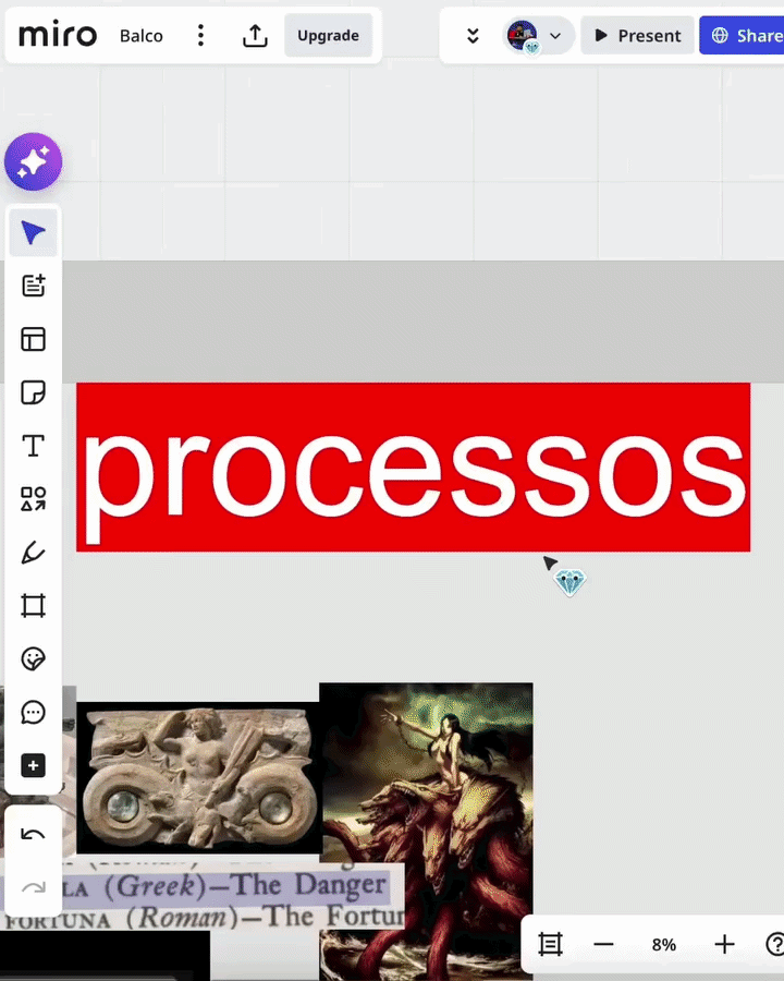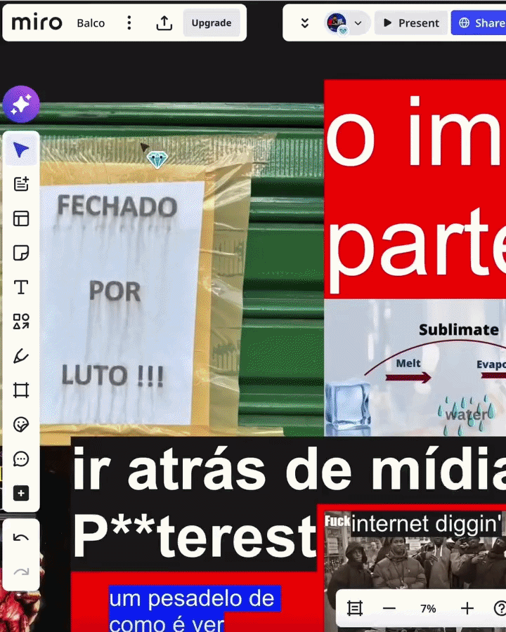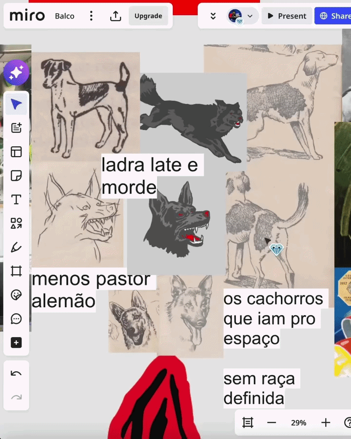 Enquanto conversávamos, Balco abriu o mapa mental que produziu no Miro, durante a criação do contralivro, e observando e o ouvindo, percebi que as referências que compõem o Mundo Cão são um mosaico de sua própria vida: são as fotografias viscerais de Brassaï e Miguel Rio Branco, as provocações de Daido Moriyama, a influência de Mano Brown e Racionais MC's, especificamente a capa de Sobrevivendo no Inferno (1997), a inesperada conexão com a cantora Enya ou com a carta de Pokémon do Gengar, simbolizando algo valioso e pesado ao mesmo tempo.