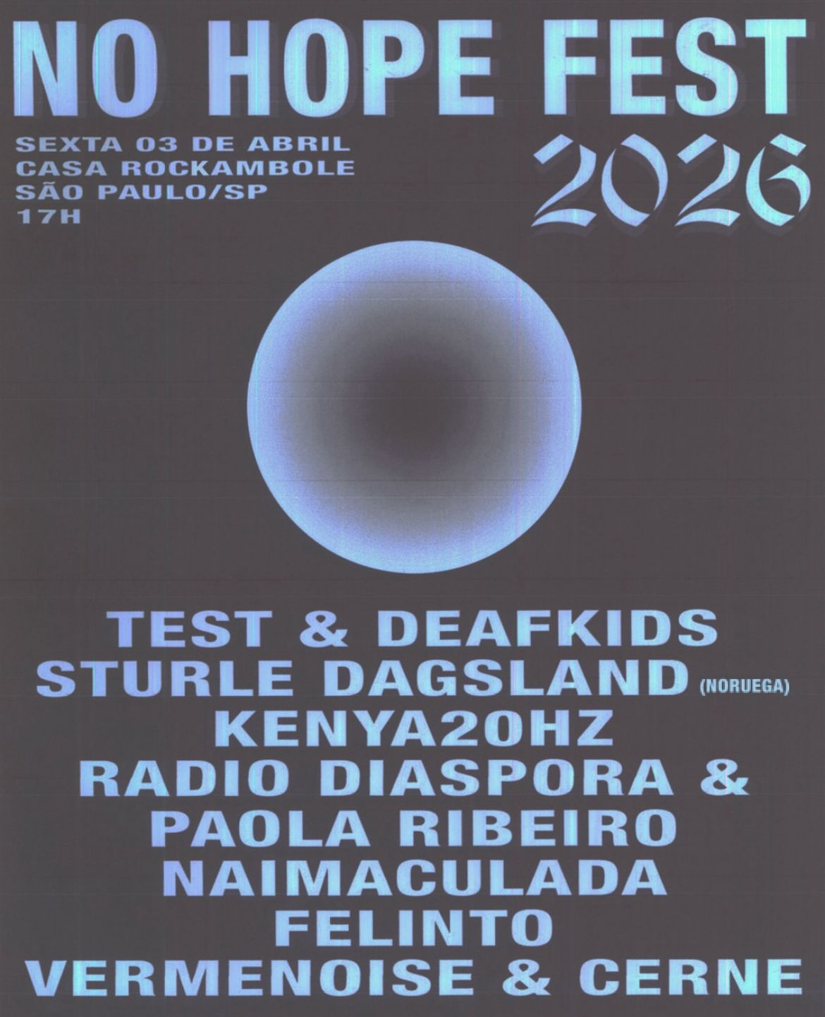 O nome do festival, assim como sua ideia, conversa com os rolês que Test e Deafkids vem fazendo juntos há uns anos, e a ideia de fazer um festival já pairava na cabeça deles há um tempo - agora colocaram em prática. No Hope é um festival de descobertas: “ a diversidade de propostas - do free jazz à música eletrônica rítimica, percussividades, música ritualística, o espírito de colaboração que permeia o nosso rolê... A ideia é justamente apresentar o novo, seja pras pessoas que não conhecem quem vai tocar, seja pra quem nunca viu essa combinação no mesmo contexto!”