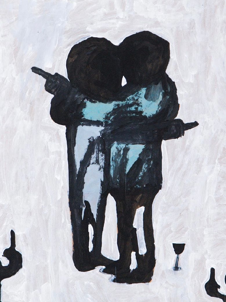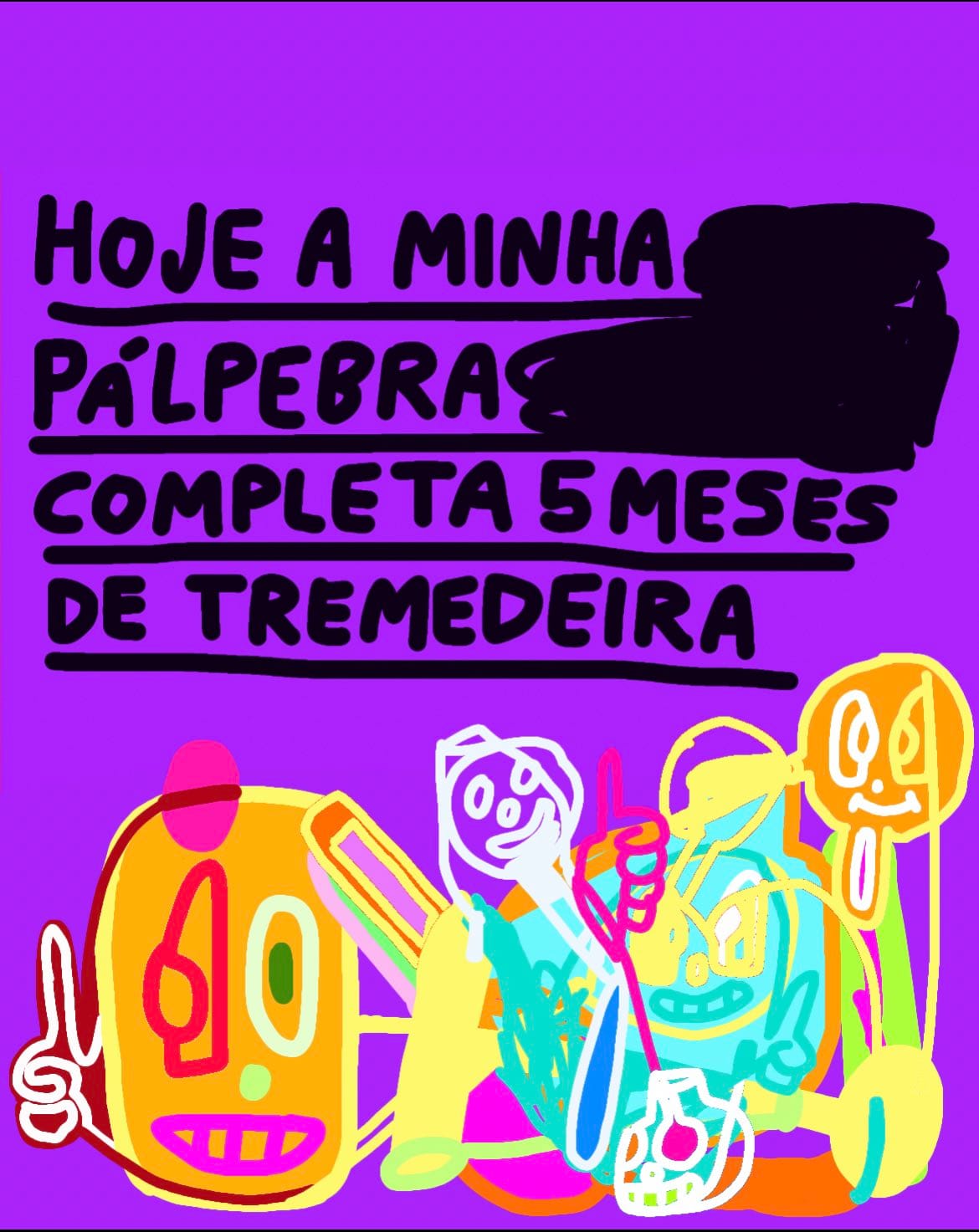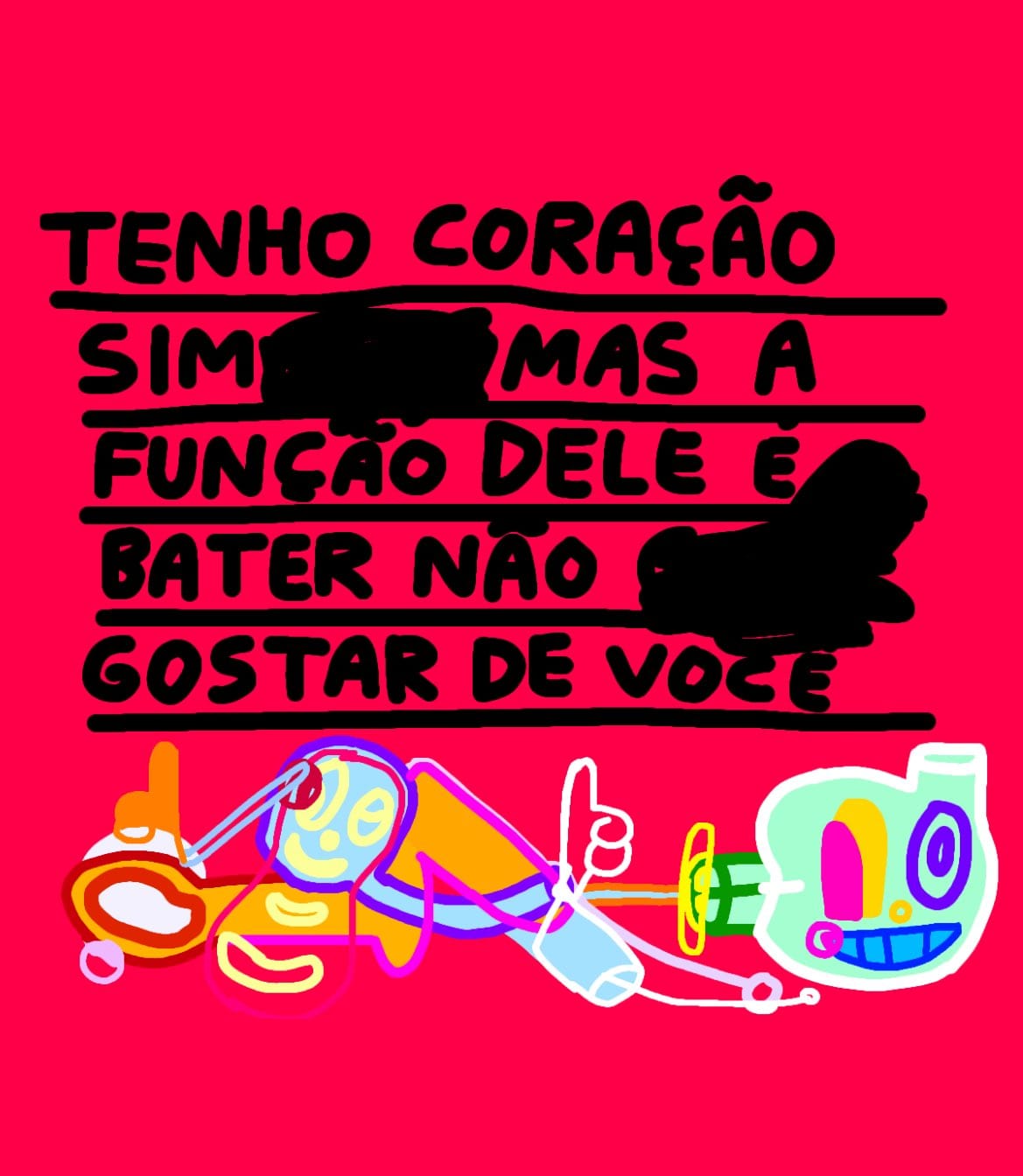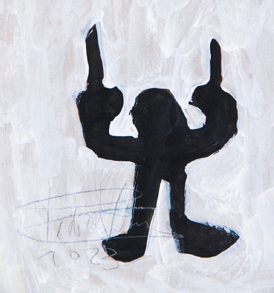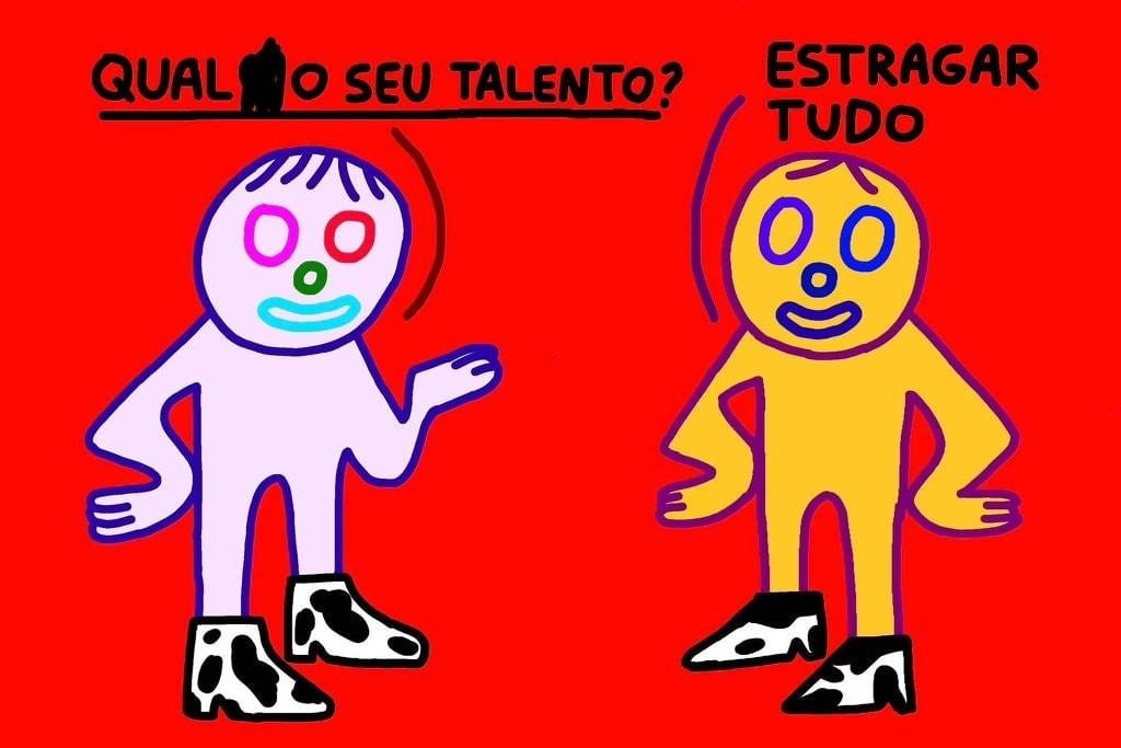 Tive um momento de crise, tipo: “porra, vou ficar com 60 anos pintando bonequinho colorido, troncho e rabiscando?” (risos) Depois pensei: “isso é meu projeto”. Quando eu faço um desenho troncho, com três dedos, não é porque eu esqueci. É porque quero assim, é uma escolha estética, é meio performático.