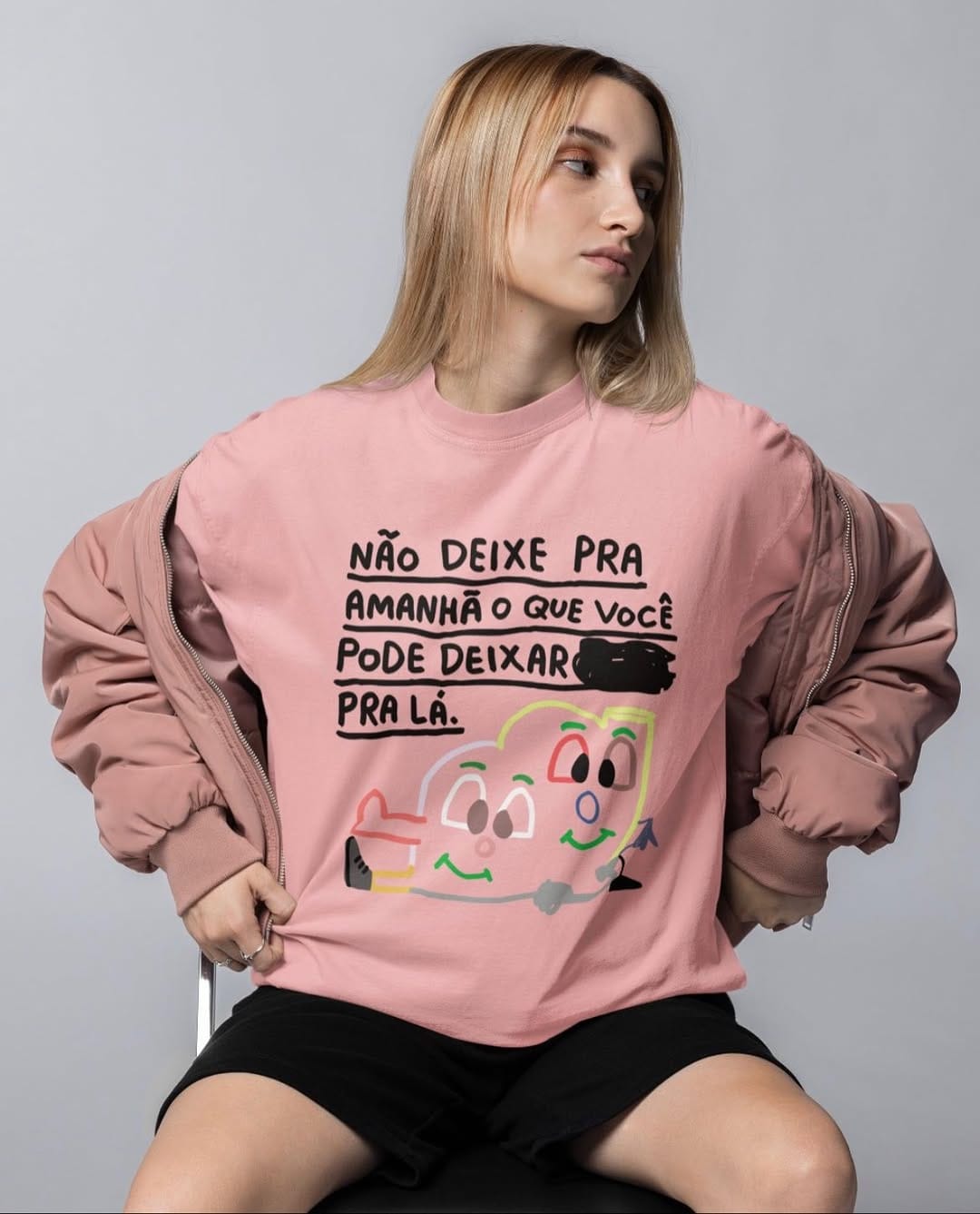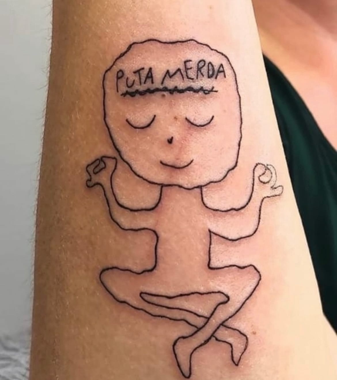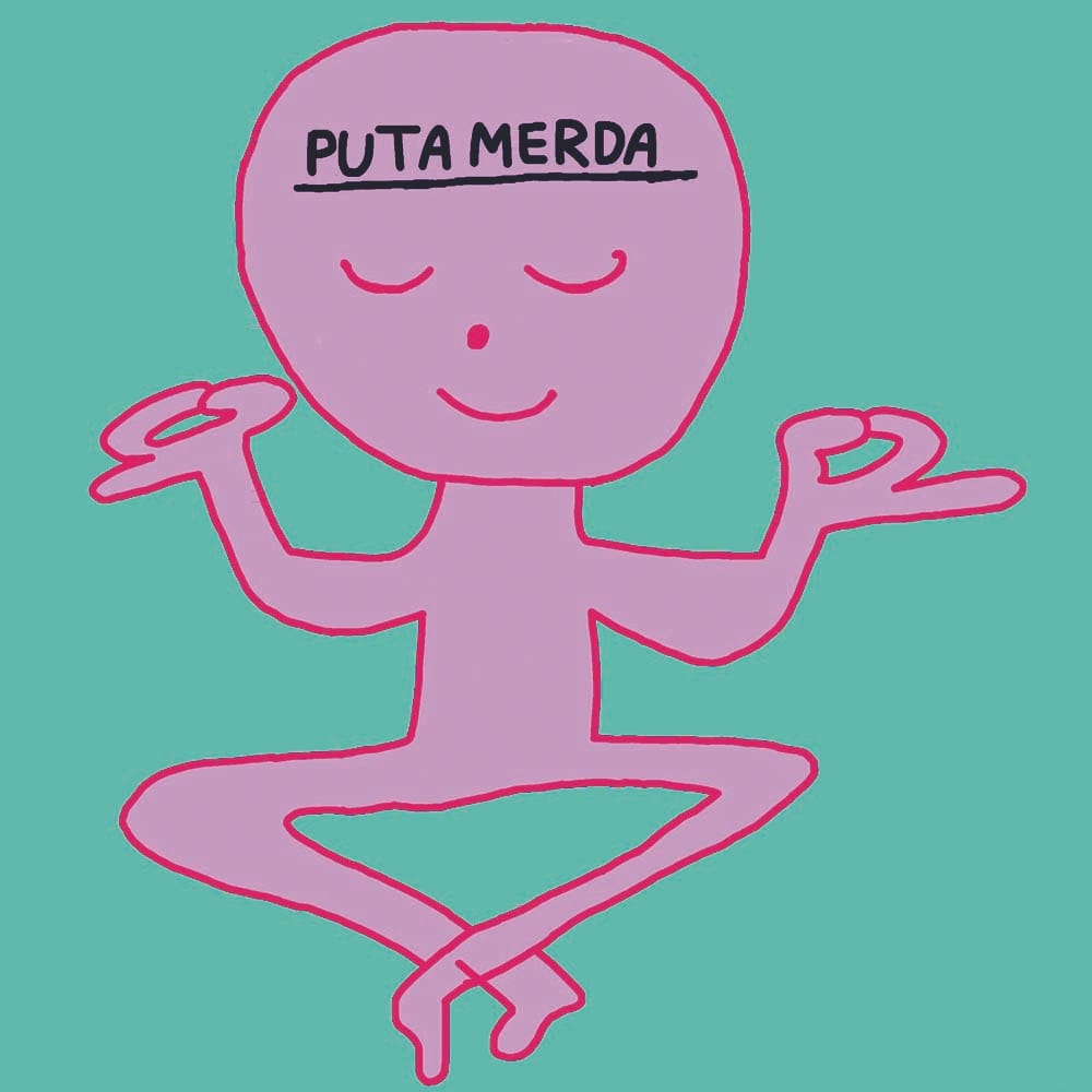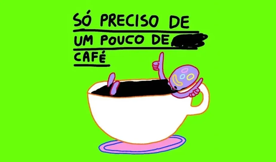 O processo criativo é muito louco, dá pra falar o dia todo. Por exemplo, aquele desenho do “puta merda” — do cara meditando e pensando — nasceu num café da manhã com meu pai. Eu tava desenhando, achei o bonequinho meditando muito clichê. Aí botei “puta merda” em cima. E virou tipo minha marca.