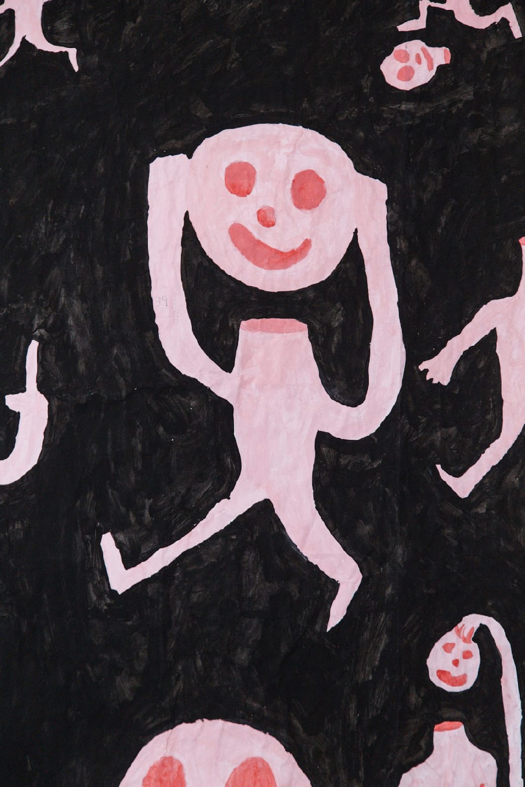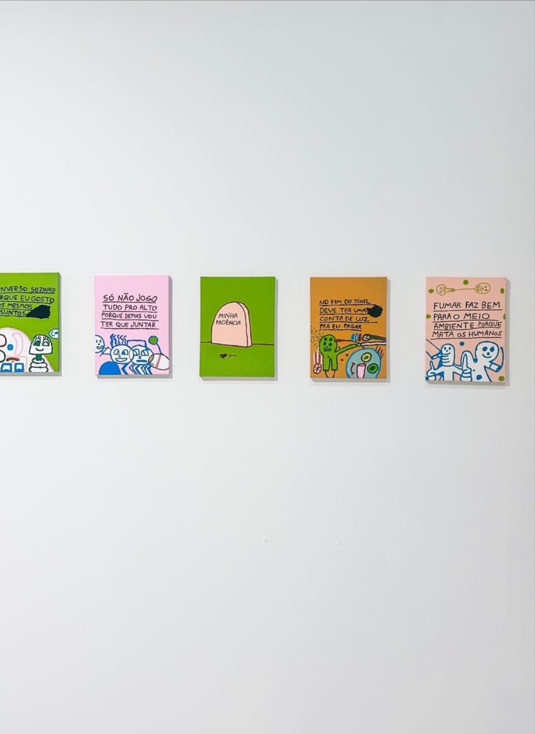 Essas pinturas eu fiz numa fase muito engraçada da minha vida, quando eu tinha 17 anos. São desenhos mais pictóricos, com técnica, sombreado. Nem parece que fui eu que pintei. Claro que tem uns bonequinhos que lembram, mas é mais enxuto, mais abstrato.