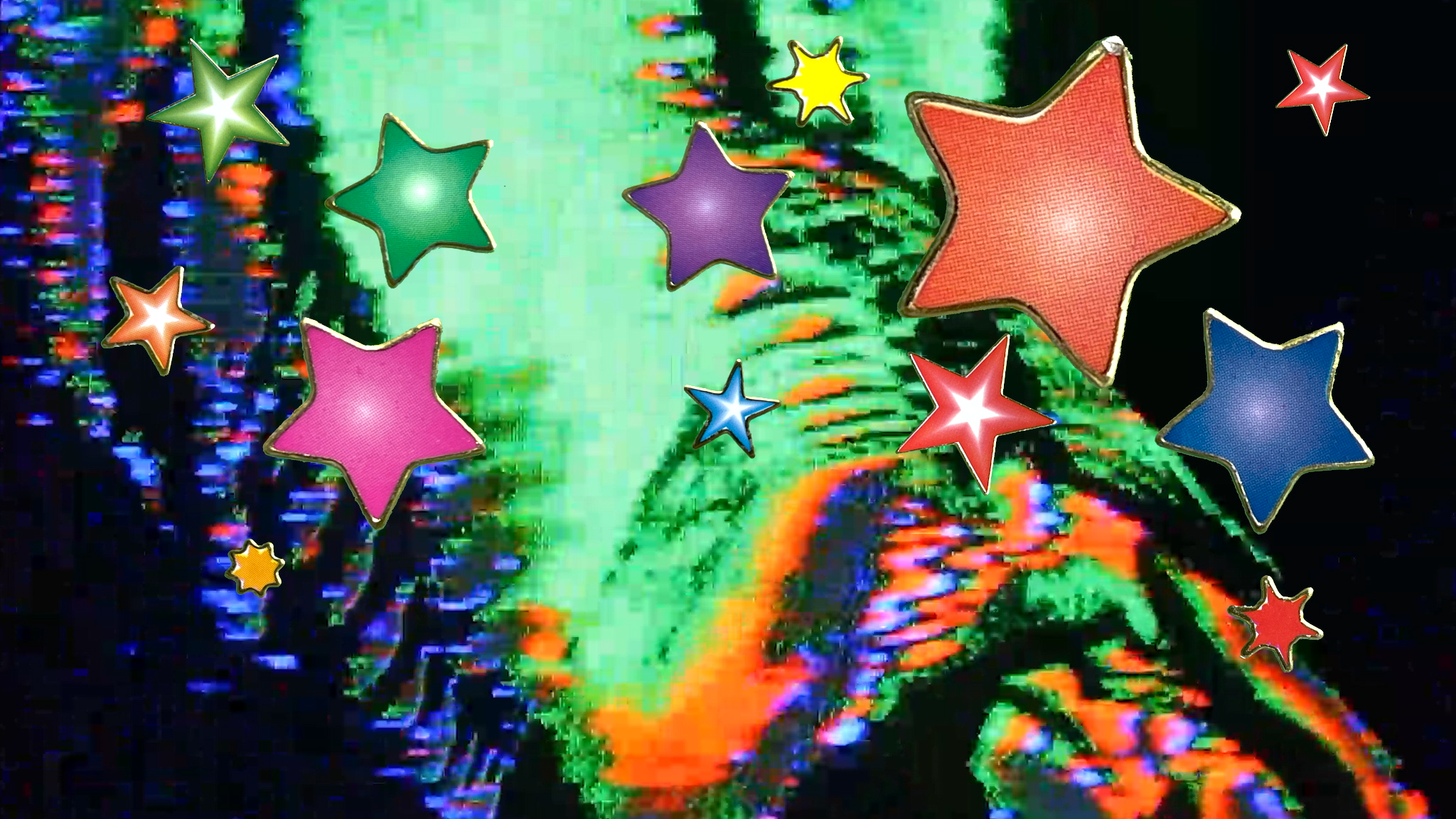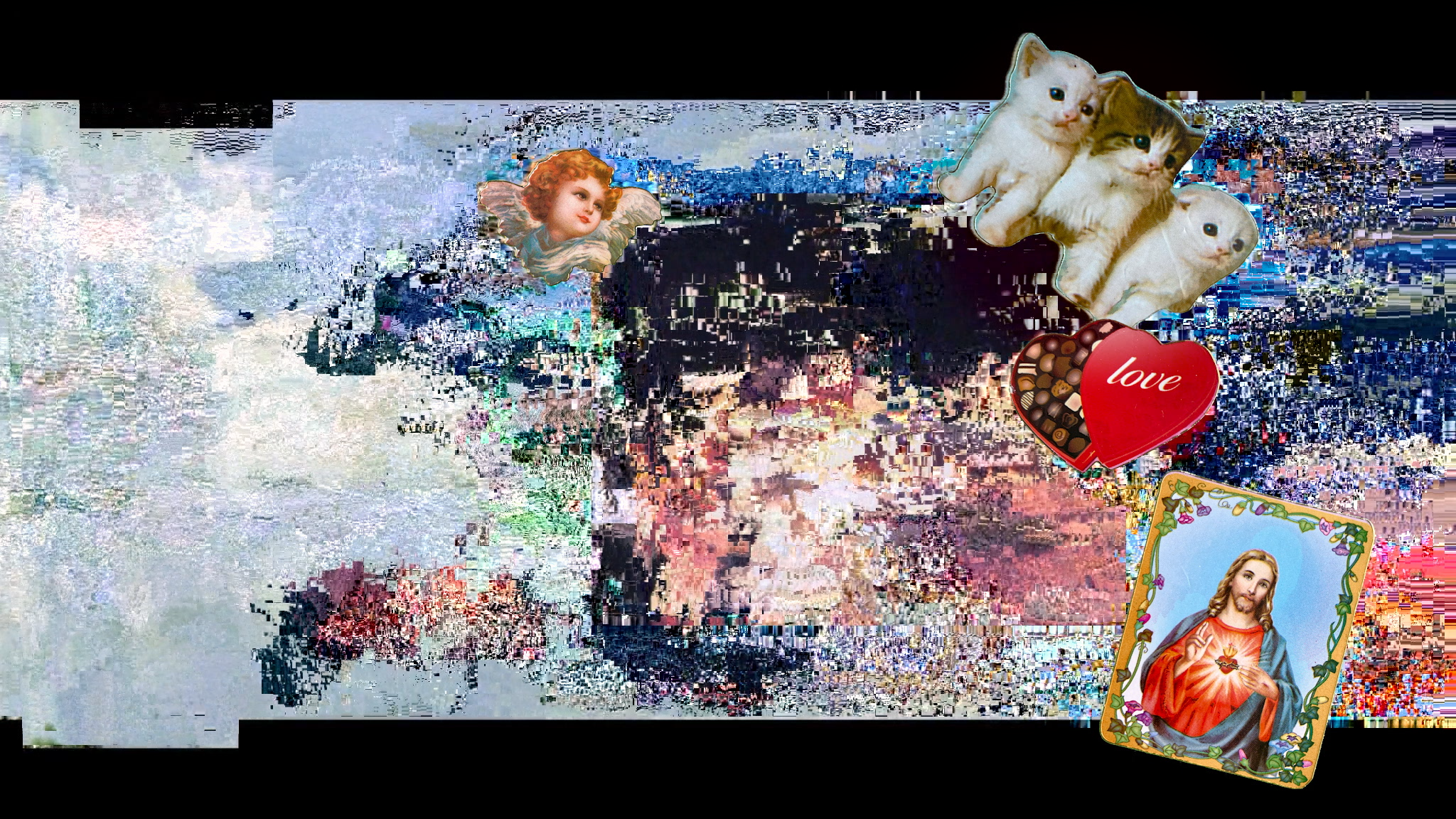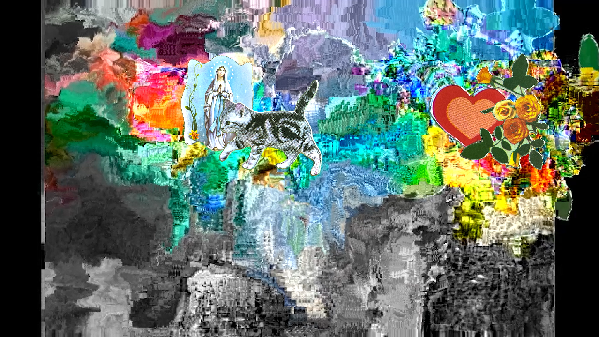 Foi muito divertido montar com essas coisas também, teve o Andrés Medina, que é uma pessoa que já trabalhou comigo em um dos meus curtas, e a gente foi ajustando isso e adicionando esses elementos — em alguns momentos tem as figurinhas por cima do 16mm, e quando tem o glitch que mistura elas realmente parece que tu pega uma massa de bolo e coloca uns chips de chocolate e vai se misturando, derretendo.