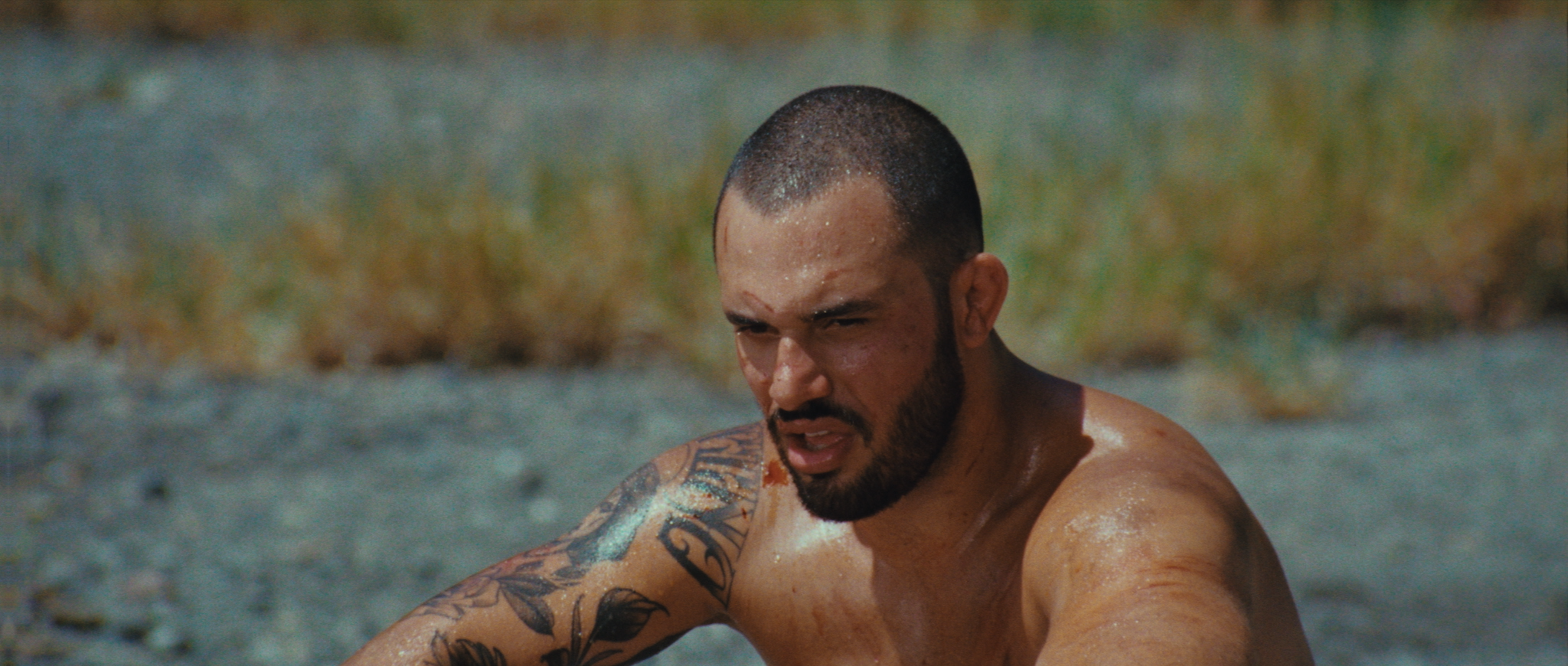 Sobre a luta, eu acho que é o que eu menos tenho uma explicação lógica para o porquê que eu fiz daquela forma. Era para ser bem mais pessoas e para ter uma coisa de corpo, de fricção, de novo com esse lance das texturas, essa coisa que eu acho muito visual, dos corpos e da textura da pele, enfim. Eu queria trazer isso, especialmente por ser uma diretora mulher, e eu sei que é um território delicado.