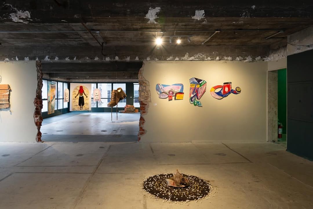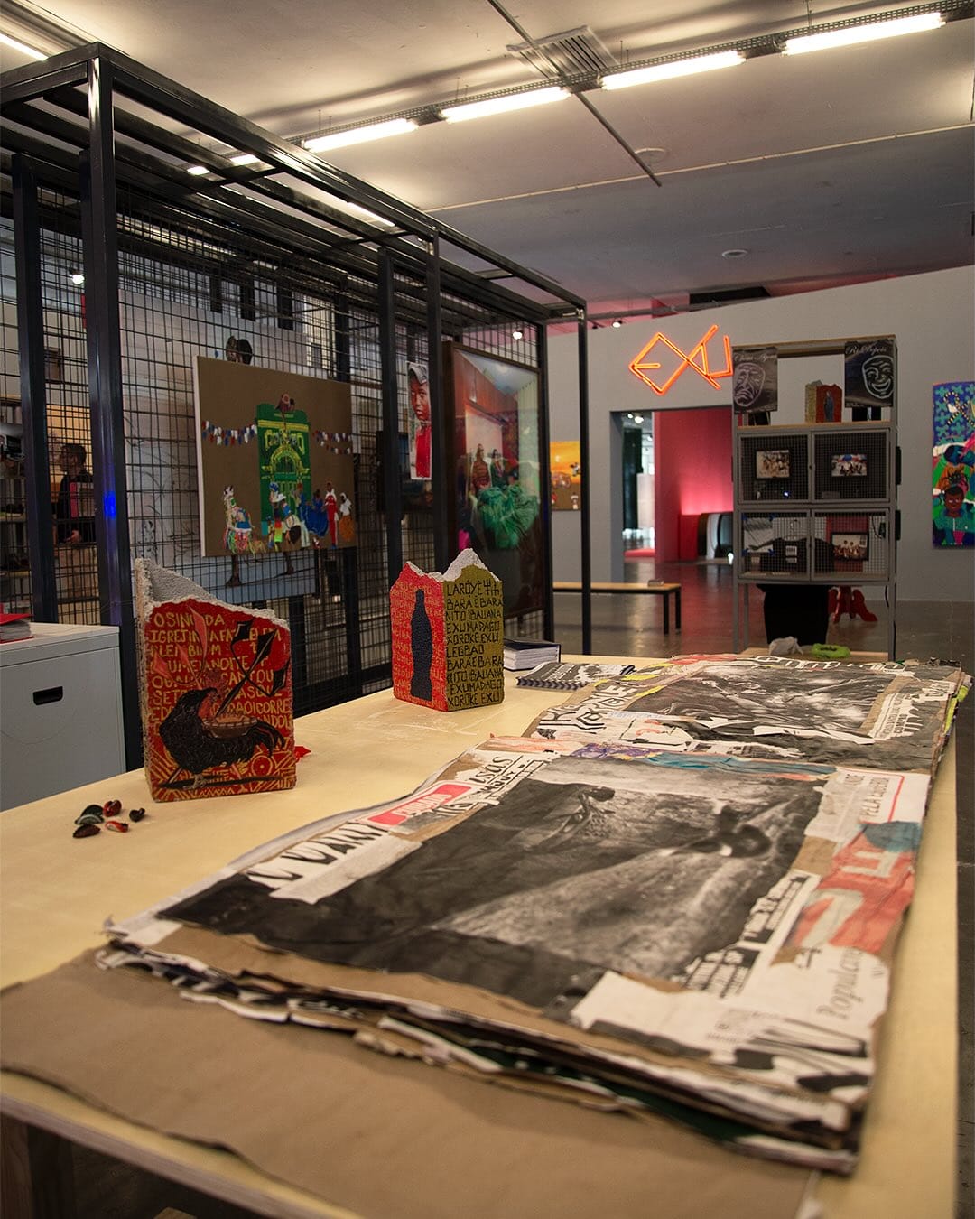 Rodrigo Zaim: Foi um lance bem natural na real, porque essa prática de mutirão e de instalação, eu acho que foi justamente isso que chamou atenção do Bona. Porque, só para deixar escuro aqui, a gente ainda não tem uma sede própria, né? A gente começou ocupando a Galeria Diáspora em 2023, mas tínhamos um tempo X para ficar lá. Saímos de lá, conseguimos um espaço na Funarte, que eles entregaram uma sala para nós que se chamava “desfazimento”, tudo que não prestava eles enfiavam naquela sala. Naqueles álbuns (fotográficos expostos na Bienal) tem fotos e registros da gente limpando essa sala que passou a ser o nosso ateliê. Então, a gente desmonta a Diáspora Galeria numa manhã e na noite do mesmo dia a gente já tá tomando cerveja e comendo pizza no nosso atelier, tá ligado?
