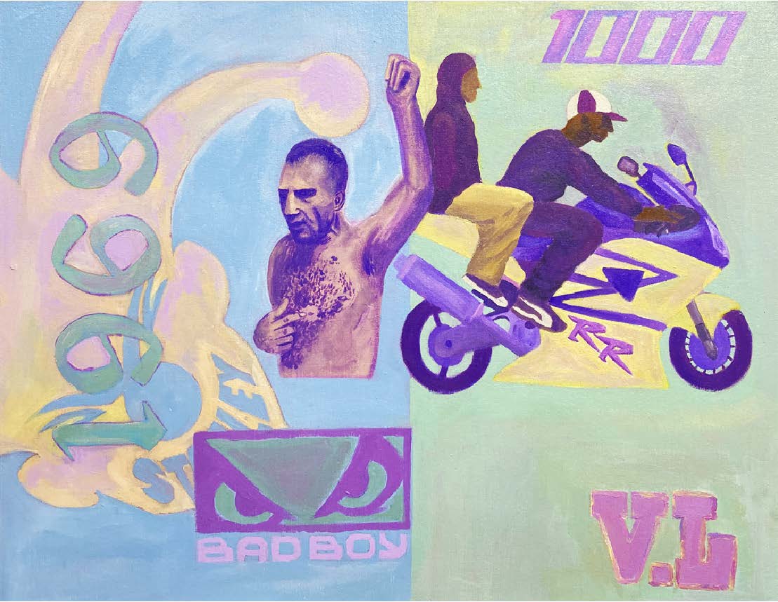 E era o que eu tentava trazer no próprio design. E aí fui para a gravura e comecei na pintura em meados de 2021, e nessa pesquisa com pintura eu trago elementos relacionados à ascensão do consumo ou a suposta ascensão do consumo, principalmente relacionada à periferia. E majoritariamente após os governos dos anos 2000 ali do PT. Então, acho que eu vou alimentando essa suposta ascensão ao consumo a partir de símbolos e códigos que foram forjados nesse momento.