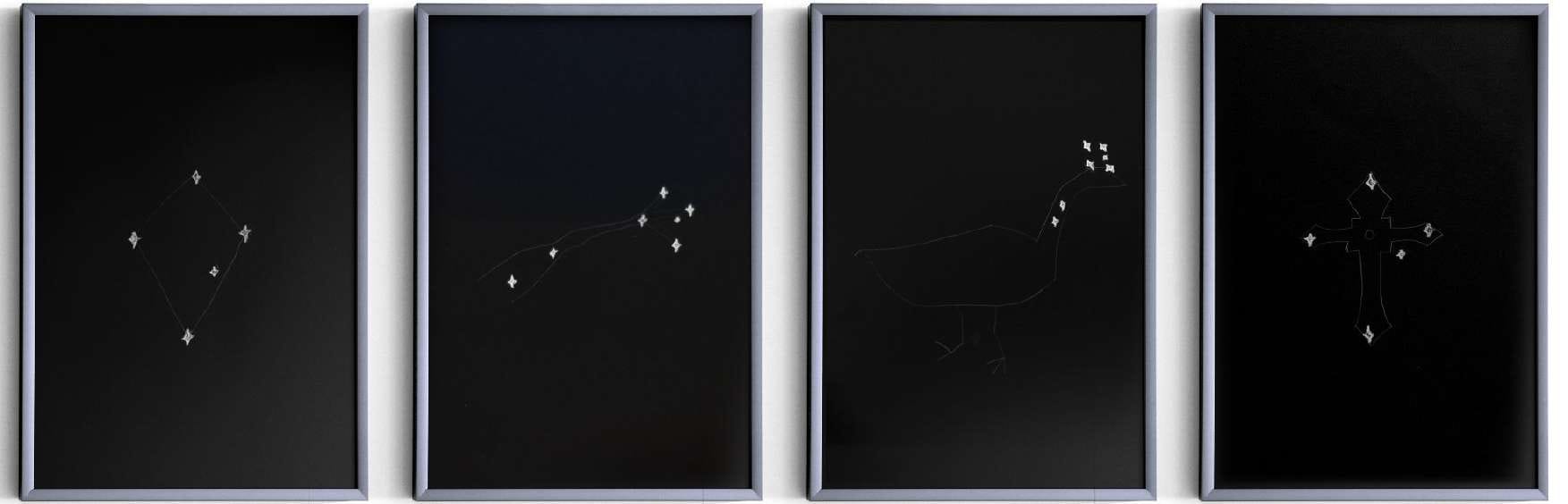 Diego Crux, Sem título #1, #2, #5 e #6 da série "Tudo que brilha no sul do céu é um infinito escuro" Desenhos em grafite e cal sobre papel curious skin black (2023 - )