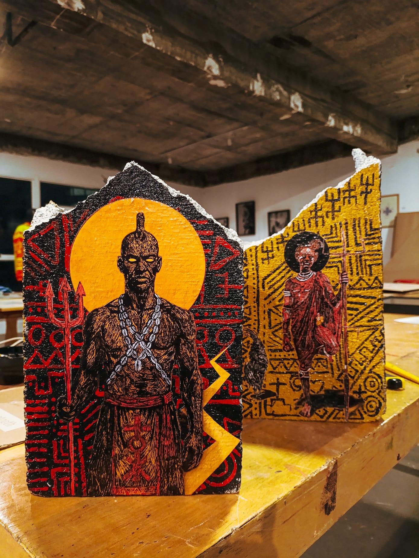 Rodrigo Zaim: Rito! O rito, a rua e a raiva. E aí é isso, é usar desses três pilares para seguir em frente. E é muito louco o quanto cada membro da irmandade influencia. Eu falo por mim, mas eu acredito que para todos, que rola uma influência geral, a gente acaba pegando um pouco de cada um, e trazendo pras nossas obras. É essa investigação aí: sou um homem muito religioso, venho de religião de matriz africana, sou um homem preto que sente raiva para cacete, por vários motivos, e a rua porque, mano, crescido, nascido e da rua até hoje. Não tem como não fazer outra coisa que não seja essa parada.