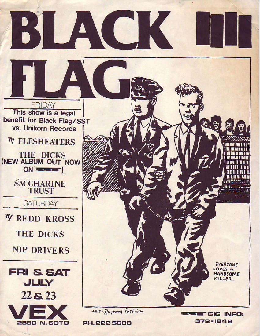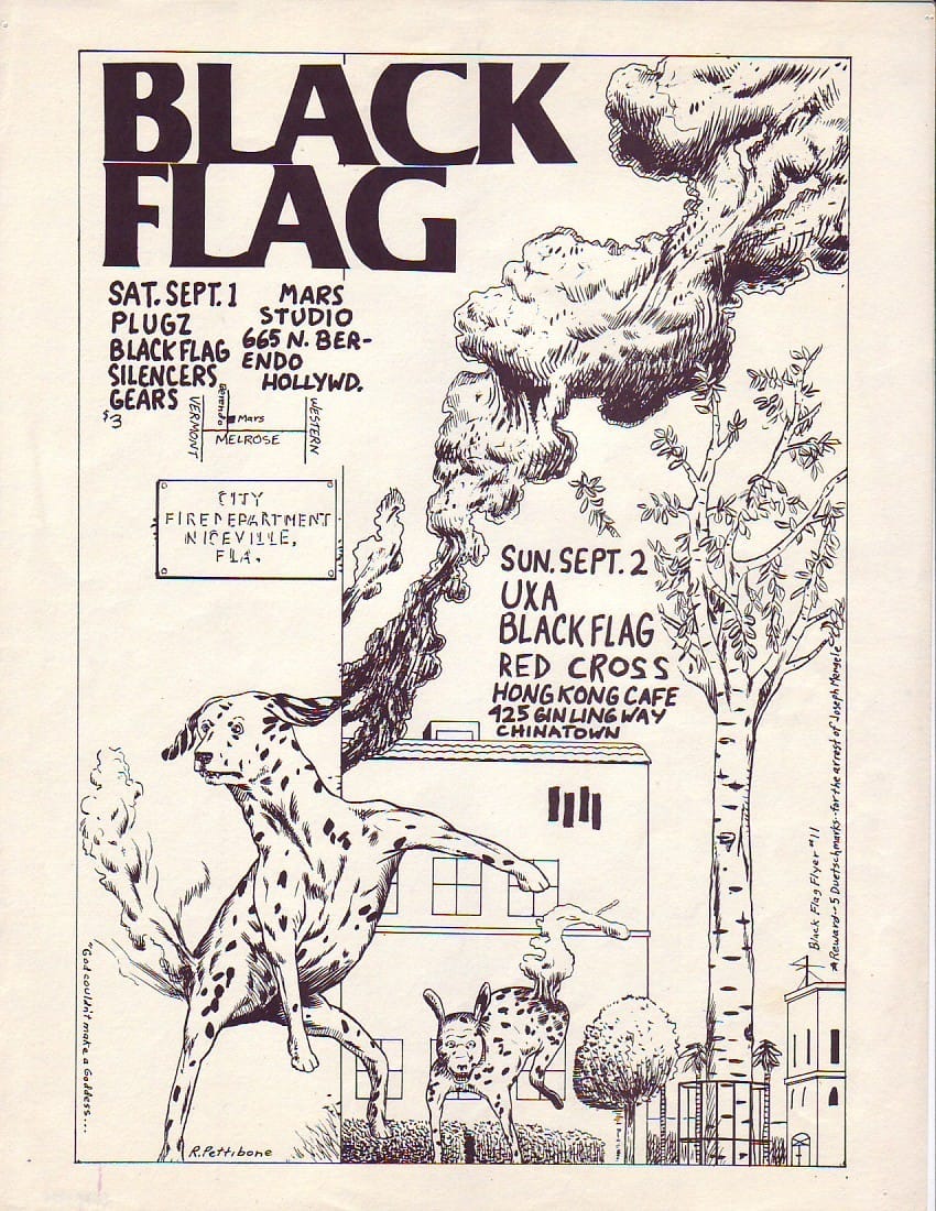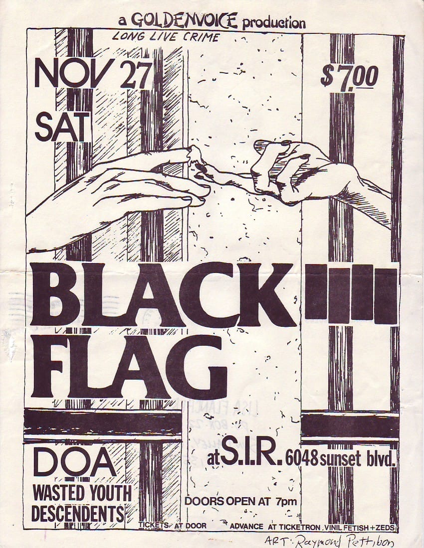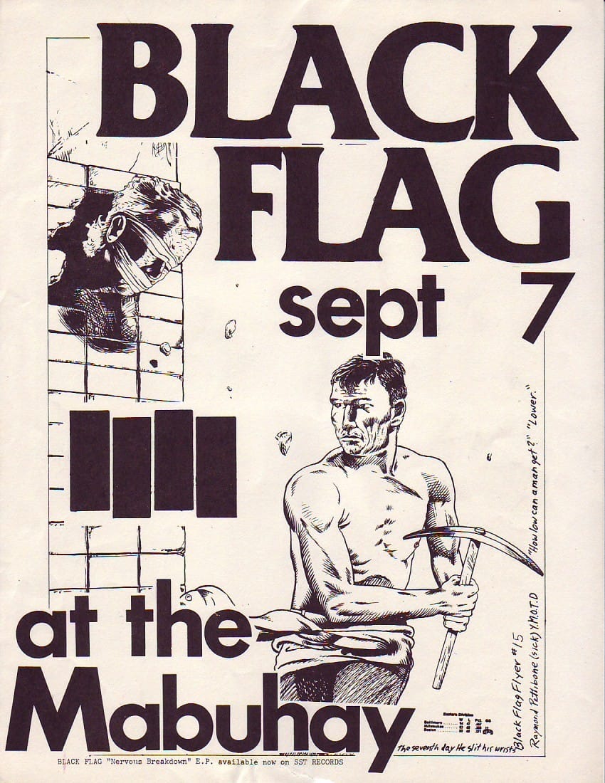 Essa potencia visual nasceu da mente e do traço de Raymond Pettibon, que no fim dos anos 1970 passou a colaborar com o selo SST Records, fundado por seu irmão Greg Ginn, guitarrista da banda. Pettibon não só batizou o grupo — sugerindo o nome “Black Flag” — como também concebeu o símbolo que se tornaria uma das marcas gráficas mais icônicas da música independente: as quatro barras pretas.