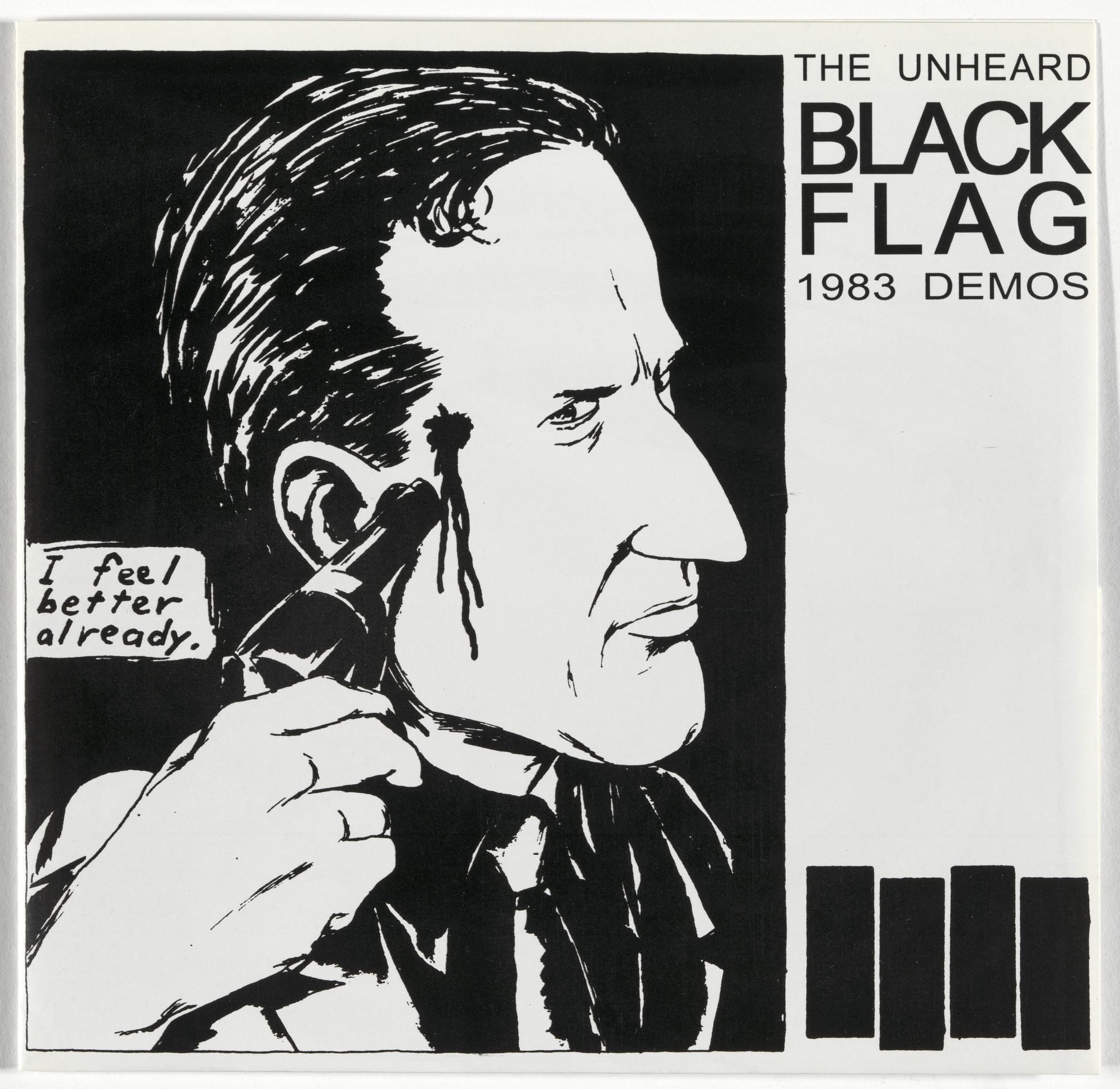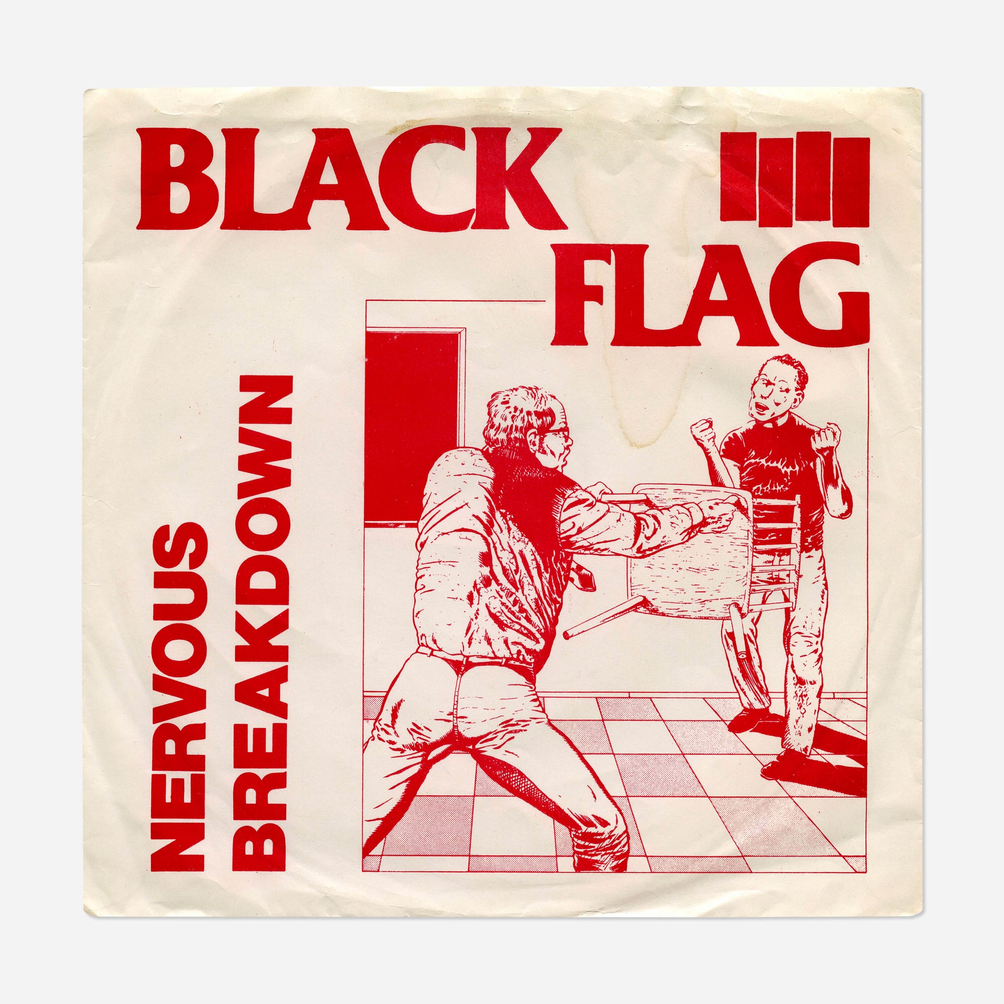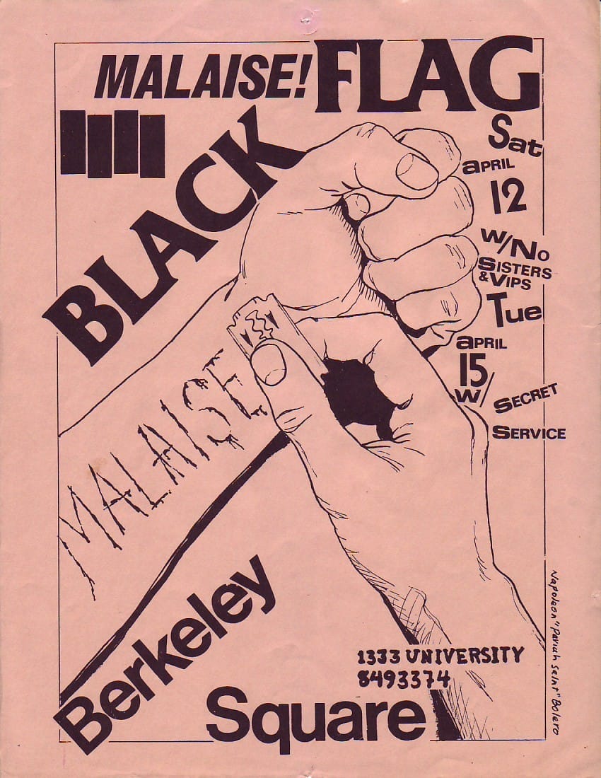 Essa potencia visual nasceu da mente e do traço de Raymond Pettibon, que no fim dos anos 1970 passou a colaborar com o selo SST Records, fundado por seu irmão Greg Ginn, guitarrista da banda. Pettibon não só batizou o grupo — sugerindo o nome “Black Flag” — como também concebeu o símbolo que se tornaria uma das marcas gráficas mais icônicas da música independente: as quatro barras pretas.