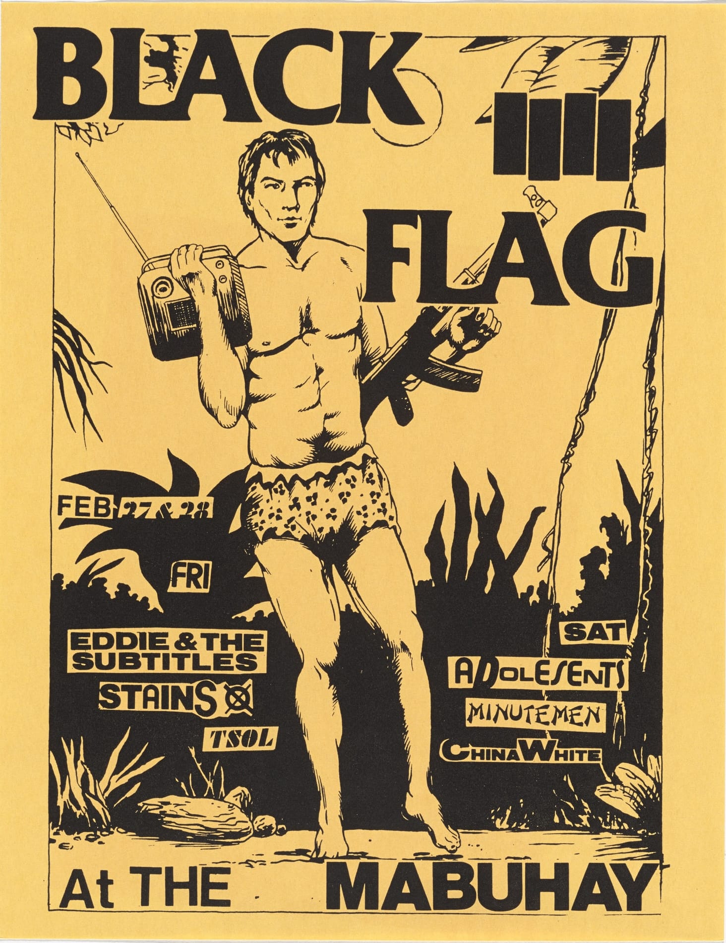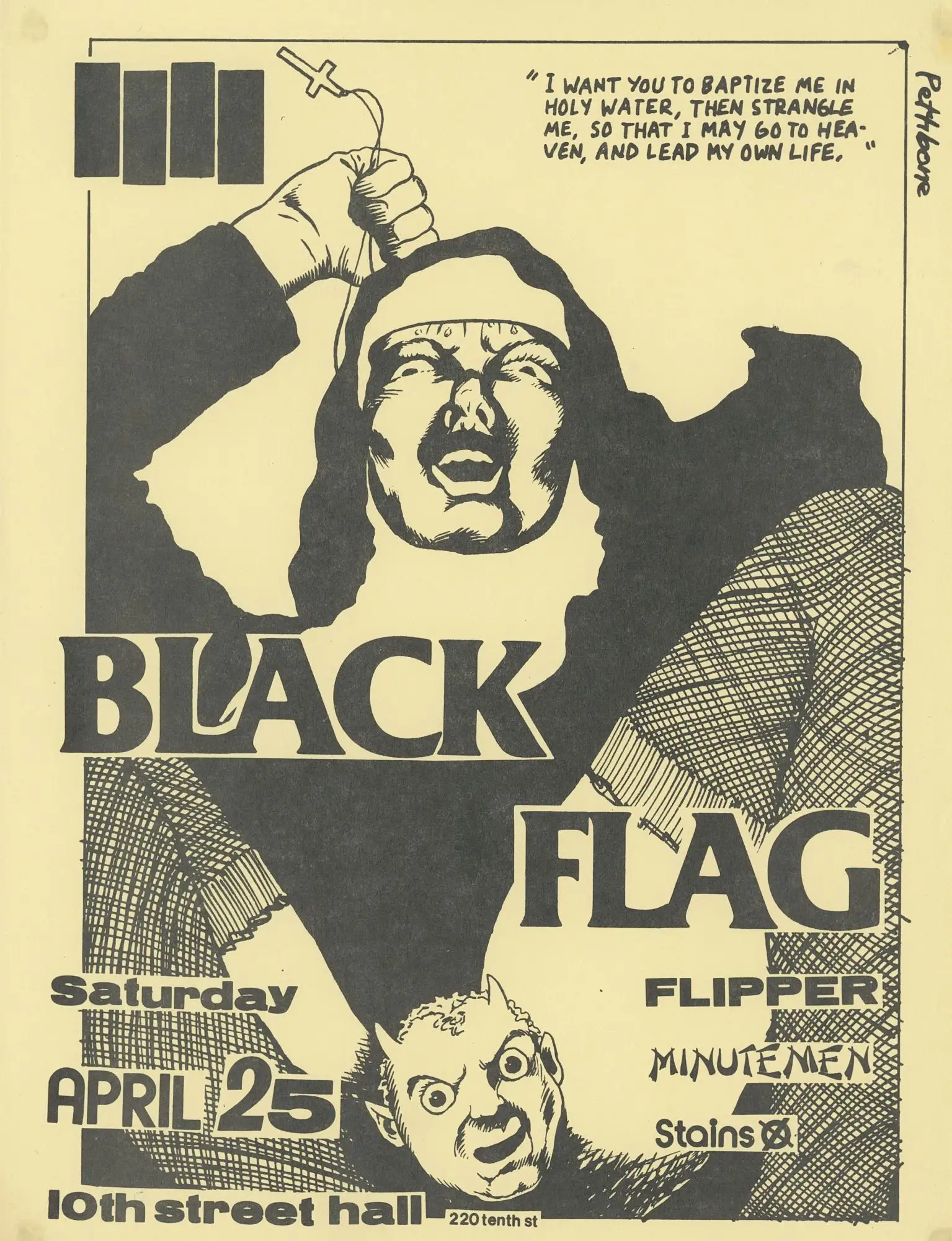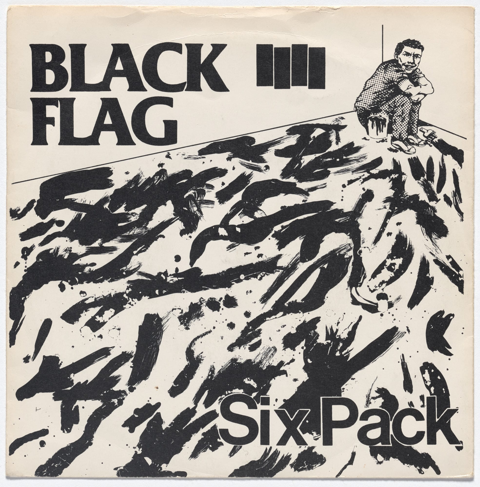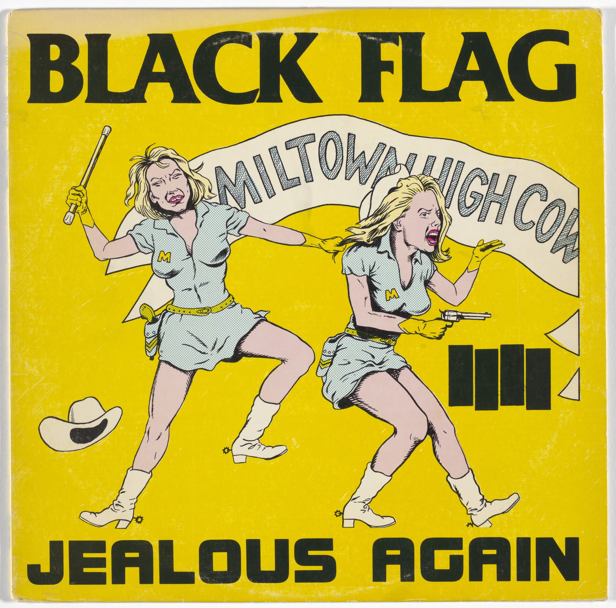 Mais do que o logo, Pettibon foi responsável por criar praticamente todo o material gráfico da banda: capas de discos, pôsteres e flyers de shows. Seu estilo cru em nanquim, sempre acompanhado de frases manuscritas carregadas de sarcasmo, violência e crítica social, traduziu visualmente o universo do Black Flag. Trabalhos para as capas de Nervous Breakdown (1979), Jealous Again (1980) e Slip It In (1984) são marcos dessa estética. Longe de funcionarem apenas como ilustrações, essas imagens expandiam o conceito da banda, materializando em papel a energia desconfortável e contestadora que estava presente nas músicas.
