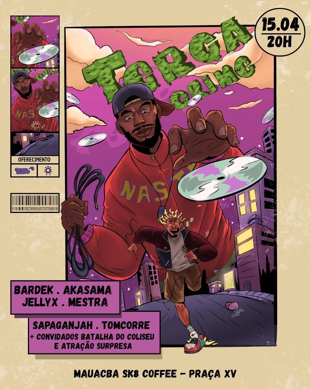 Uma das dificuldades é que a gente não tem mais a casa em que a gente fazia o projeto antes, o São Dom Dom, que fechou por motivos estruturais. Mas a gente não vai parar, a gente vai arrumar outra casa, caso funcione até meia noite, nós vamos catar a caixa de som, vamos para frente do São Dom Dom e vai torar o pau até a polícia nos mandar embora. Porque a gente é preto, favelado, periférico fazendo cultura, se fosse playboy não ia acontecer isso, então nós vamos ficar lá até o pau torar. E eu estou pensando em comprar uns sprays de tinta para a galera — xarpi sempre esteve muito junto — para mim é o bate cabeça, xarpi, faz muito parte do grime, como se fosse uma coisa só, então eu não consigo separar. Já sei que no aniversário do Terça, vou comprar umas seis latas e vai ser bagunça.