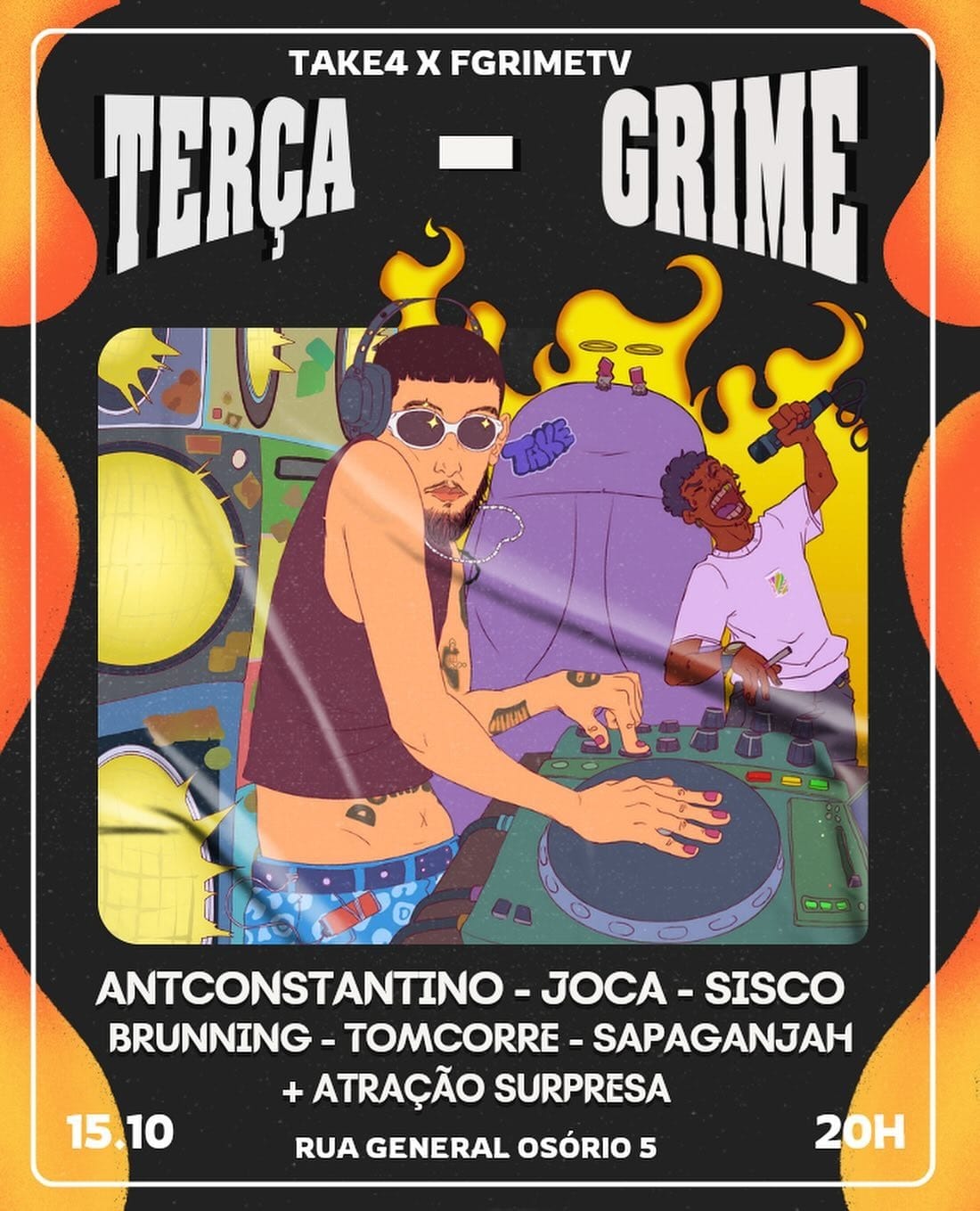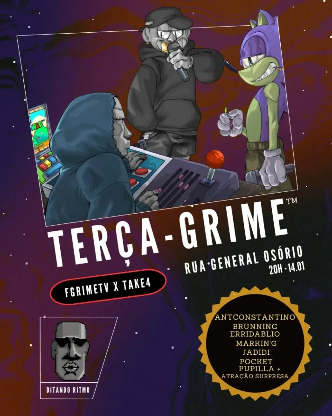 Tinha grime? Não vou falar que não tinha. O Tom, que é meu sócio no Terça, ele tinha a roda do Calimbá — aqui no Rio de Janeiro é covardia sem fim, o Tomás tinha um amigo que gostava muito de grime. Quando o Salatiel morreu na covardia, o Tomás saiu pixando a cidade inteira, e criou a Roda Cultural do Calimbá — nos finais da roda ele metia um grime e o MC que queria pular, pulava. Nos eventos da Take4 ele sempre puxava, mas não tinha um evento dedicado para o grime, onde você ia ouvir desde a criação do grime até essa dinâmica de agora, com MC, então o Terça Grime de fato foi o primeiro a olhar para o MC e falar: "gostou de grime? Então vem aprender o que é."